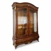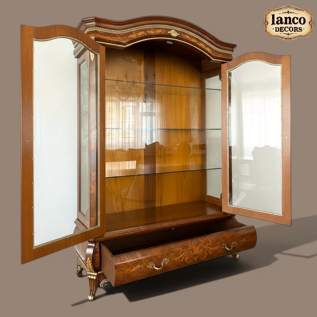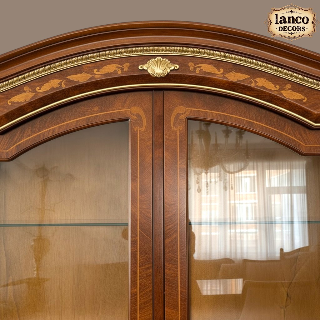 Crafted from premium solid teakwood, it features exquisite hand-carved detailing enhanced with a rich polished finish. The glass-paneled doors provide a clear, elegant display while maintaining a sense of sophistication. The curved structure, delicate carvings, and ornate accents elevate this piece into a true statement of royal design.