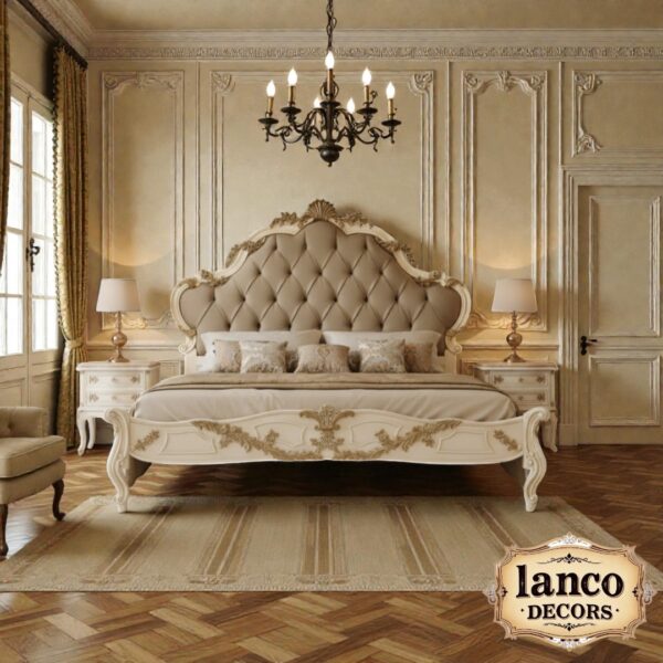 Aks-e-Riyasat Bed Set – Tehzeeb Edition by Lanco Decors is where timeless craftsmanship meets royal aesthetics. Designed for those with a taste for classic opulence, this king-size bed features:
