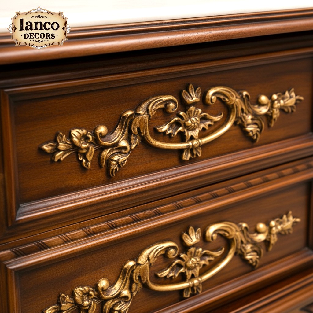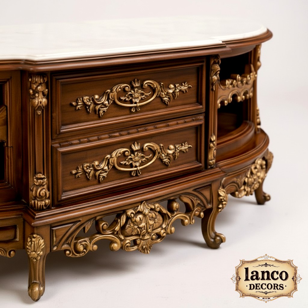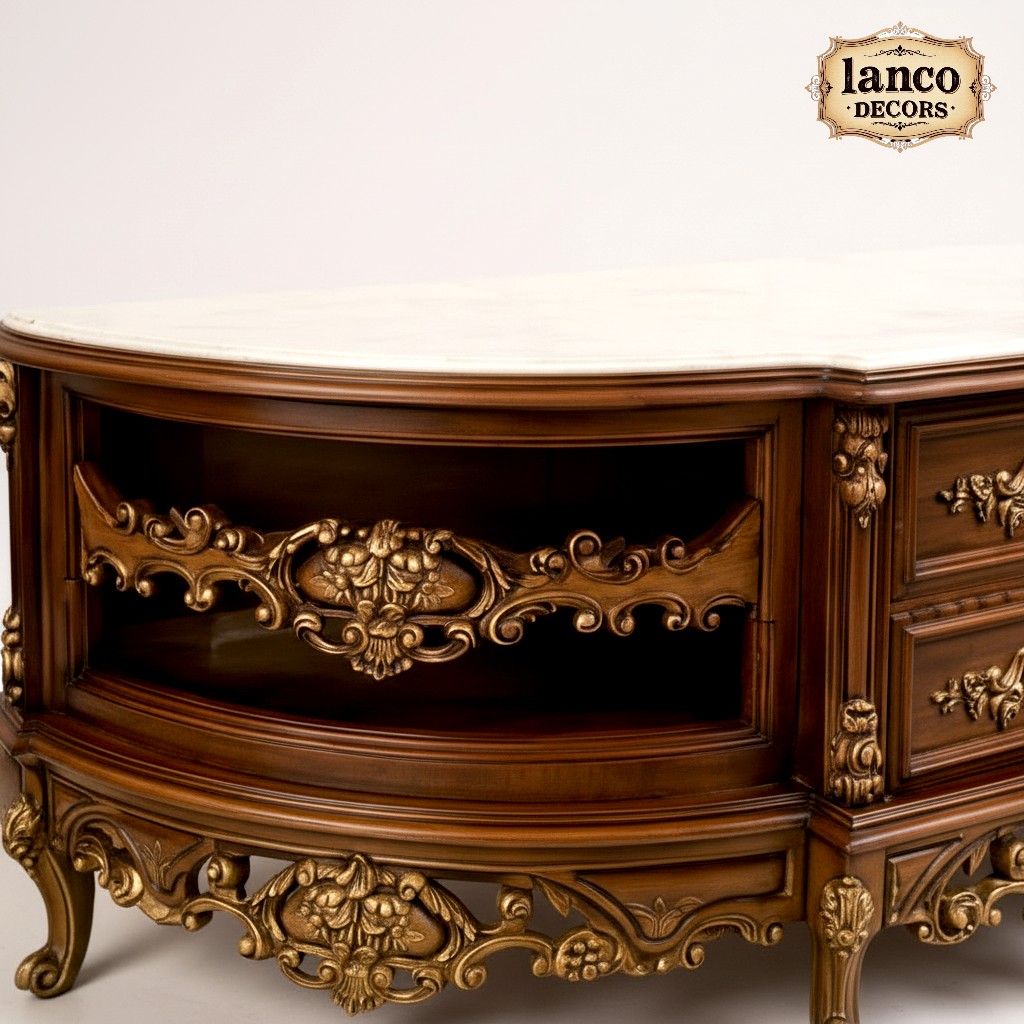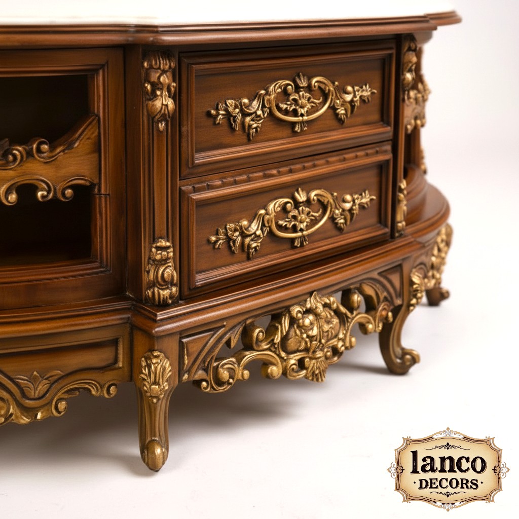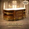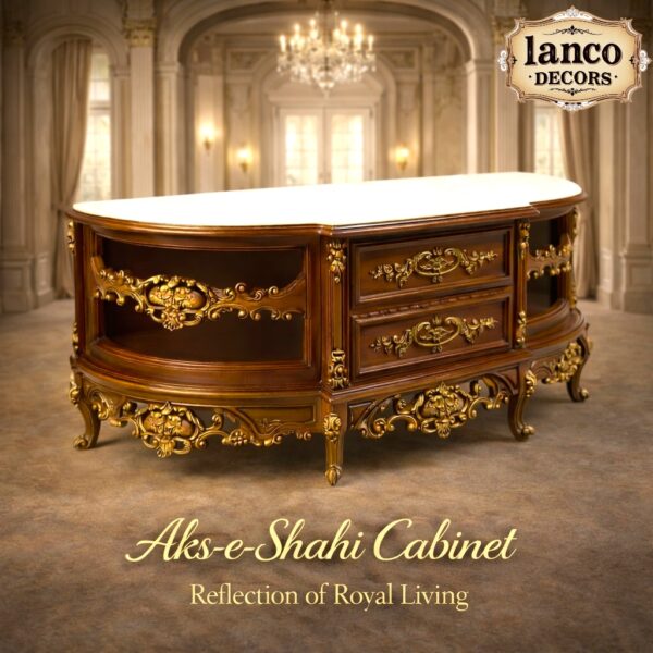 The Aks-e-Shahi Cabinet from Lanco Decors is an exquisite fusion of classical Persian design and European baroque detailing. With hand-carved floral motifs, lustrous golden accents, and a beautifully contoured silhouette, this piece is the centerpiece your palatial fantasy deserves.
