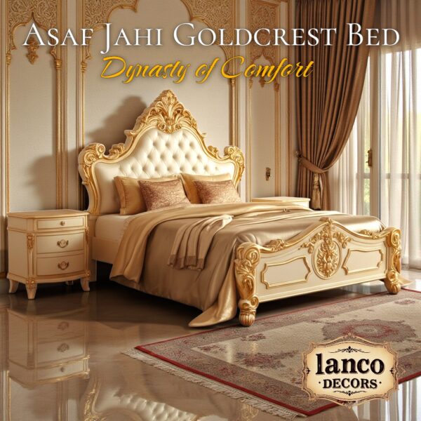Bring home the majesty of a bygone era with the Asaf Jahi Goldcrest Bed, an exquisite centerpiece from Lanco Decors. Inspired by the regal elegance of the Asaf Jahi dynasty, this handcrafted bed is an ode to opulence, featuring: