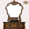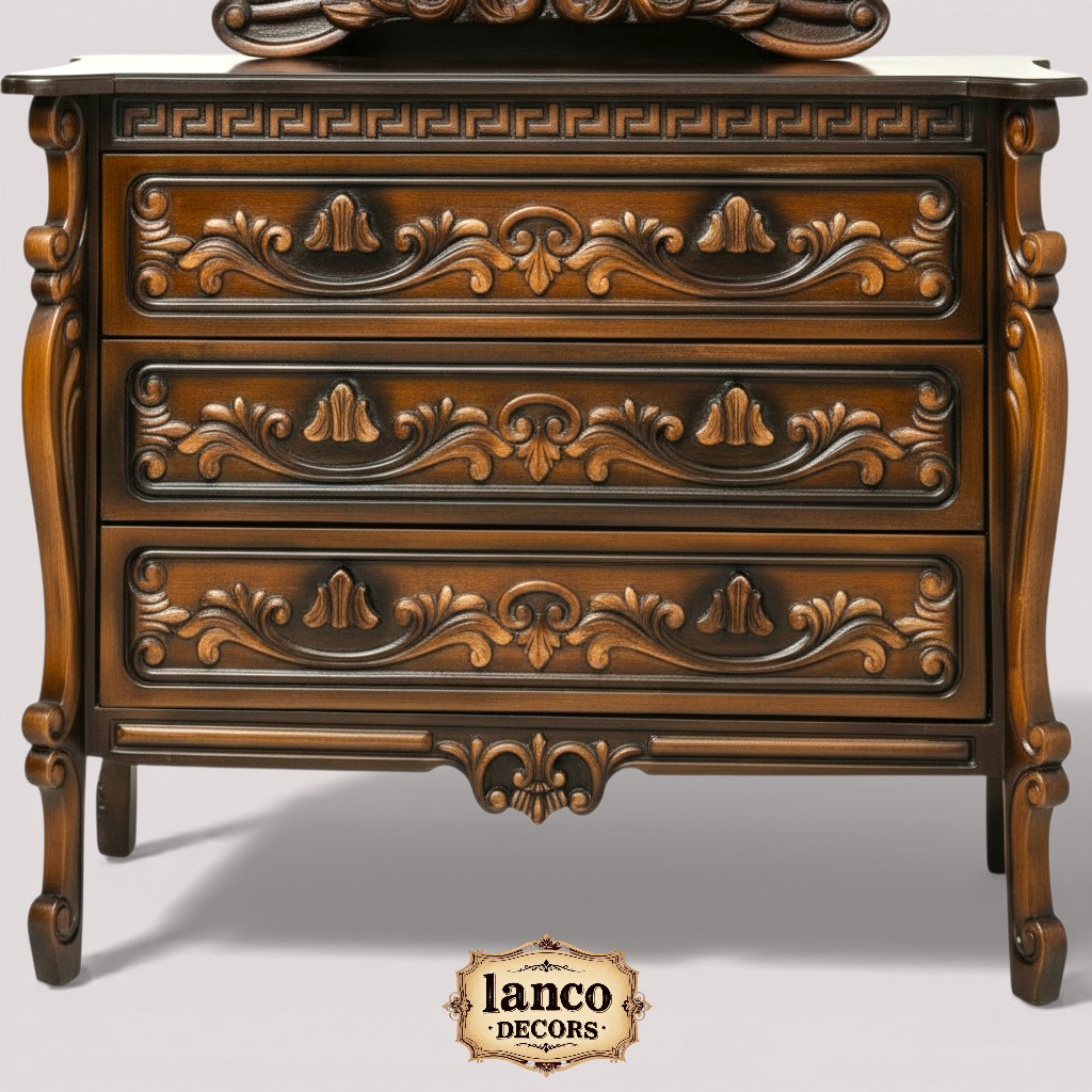 Designed with three spacious drawers, it offers practical storage for your essentials without compromising its majestic aesthetic. The curved legs and decorative motifs bring depth, luxury, and sophistication to any bedroom or dressing area.