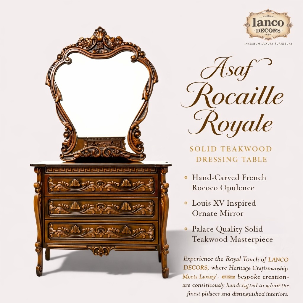 The Asaf Rocaille Royale Solid Teakwood Dressing Table is not just furniture — it’s a statement. Inspired by classic Rococo elegance, this masterpiece features intricate hand-carved detailing, a gracefully sculpted frame, and a regal mirror that commands attention.