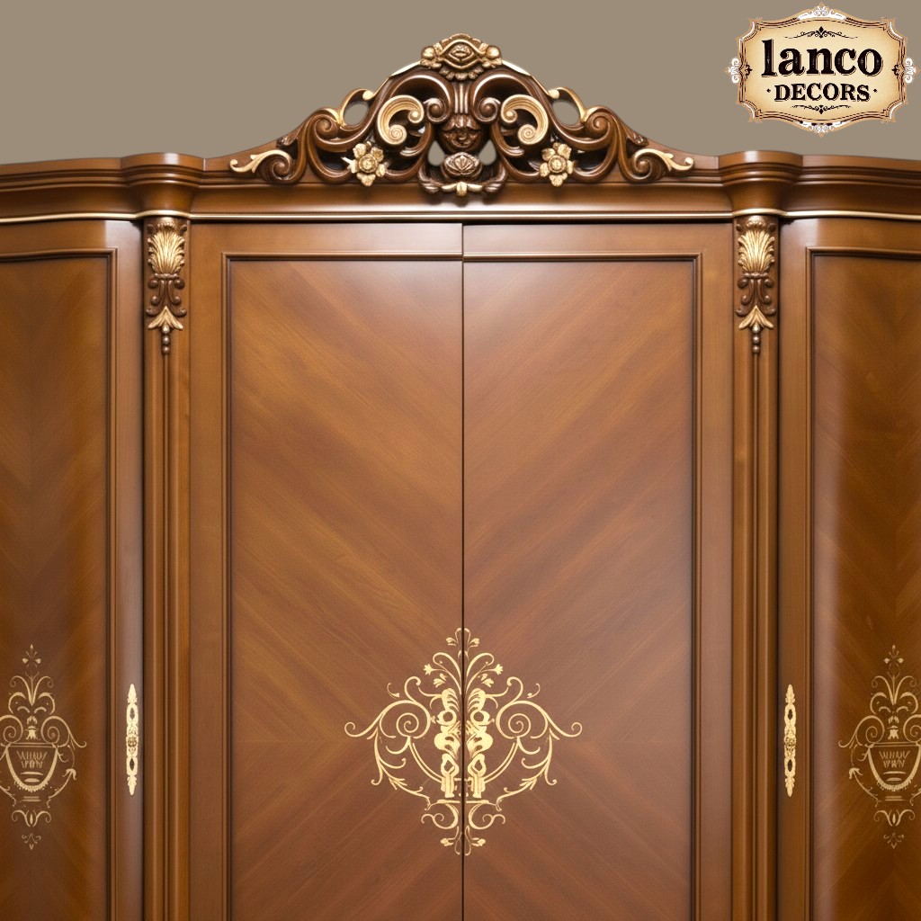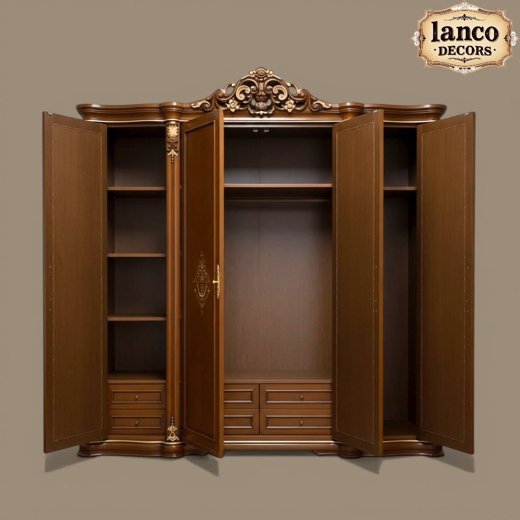 Handcrafted from premium solid teakwood, this luxury wardrobe reflects the grandeur of classic palace interiors. Inspired by European Rococo and royal heritage design, the wardrobe features intricate crown carvings, elegant panel detailing, and a perfectly balanced symmetrical structure.