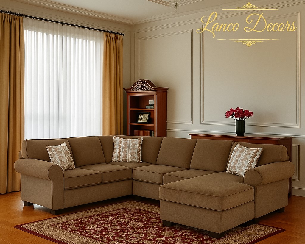 Bring timeless charm and modern comfort to your living space with the Lanco Decors Classic L Shape Sofa. Wrapped in rich cinnamon-hued upholstery and supported by a sturdy hardwood frame, this sectional features deep seating, rolled arms, and patterned cushions for that perfect blend of coziness and class. Ideal for families, lounges, or luxury spaces seeking elegance in simplicity.