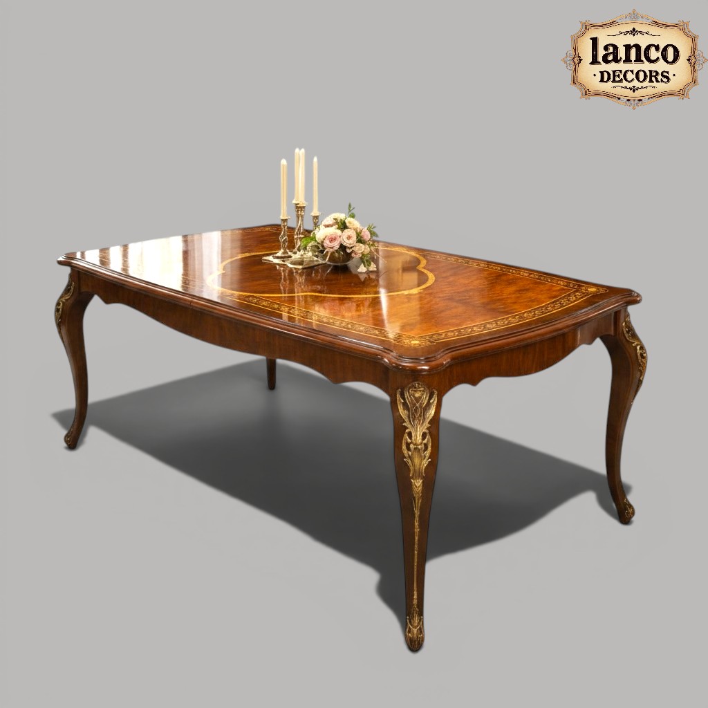 Expertly handcrafted from premium solid teakwood, this dining set features a grand rectangular table adorned with intricate inlay work and finely carved legs that reflect timeless craftsmanship. The upholstered chairs are designed for both comfort and elegance, enhancing the luxurious ambiance of your dining space.