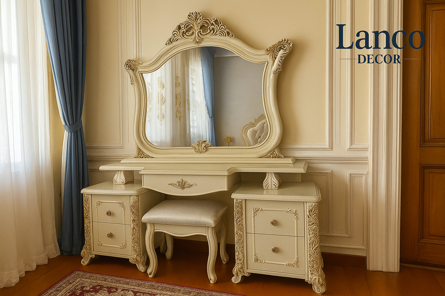 The Elanora Imperial Vanity Set by Lanco Decors is a true embodiment of grace and grandeur. Handcrafted in a creamy ivory finish with ornate floral carvings and golden accents, this dressing table features a sculptural mirror that draws all the lightโand all the attention. Paired with a soft velvet cushioned stool and deep storage drawers, itโs perfect for bridal spaces, vintage-inspired rooms, and suites that demand a statement of style. Every brushstroke, every look, every memoryโbegins here.
