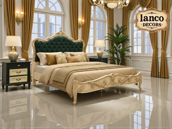 Say hello to the drama queen of all beds – the Emerald Royale Velvet Panel Bed by Lanco Decors. Featuring a deep emerald green, tufted velvet headboard framed in ornate antique gold carving, this bed doesn’t just sit in your room – it reigns over it.