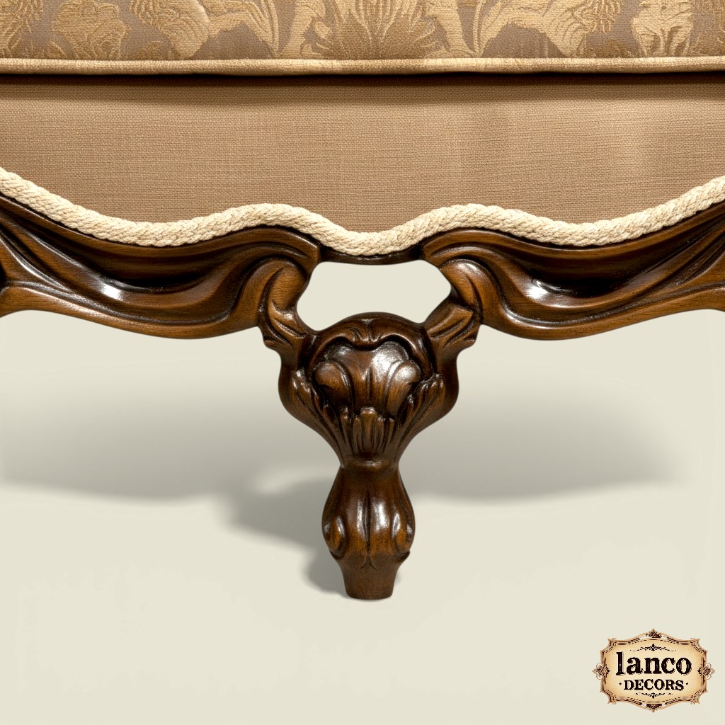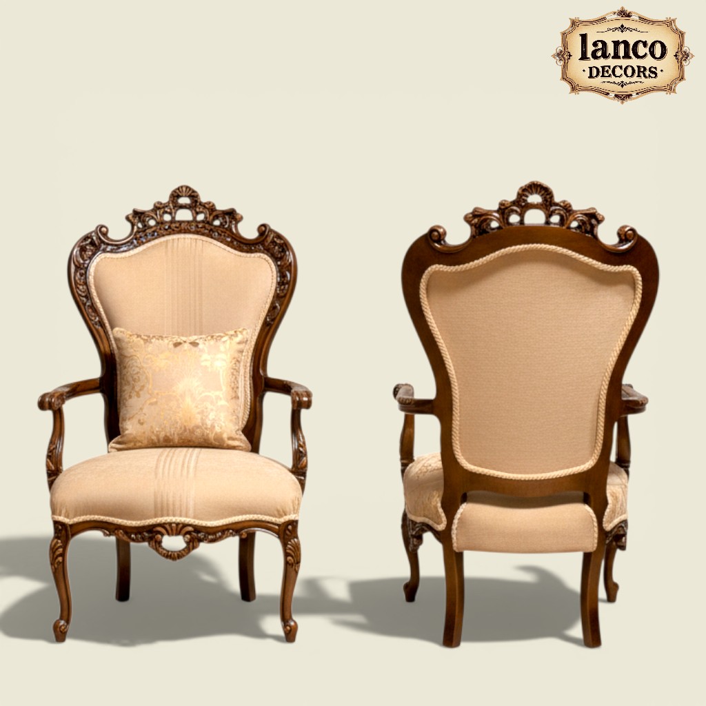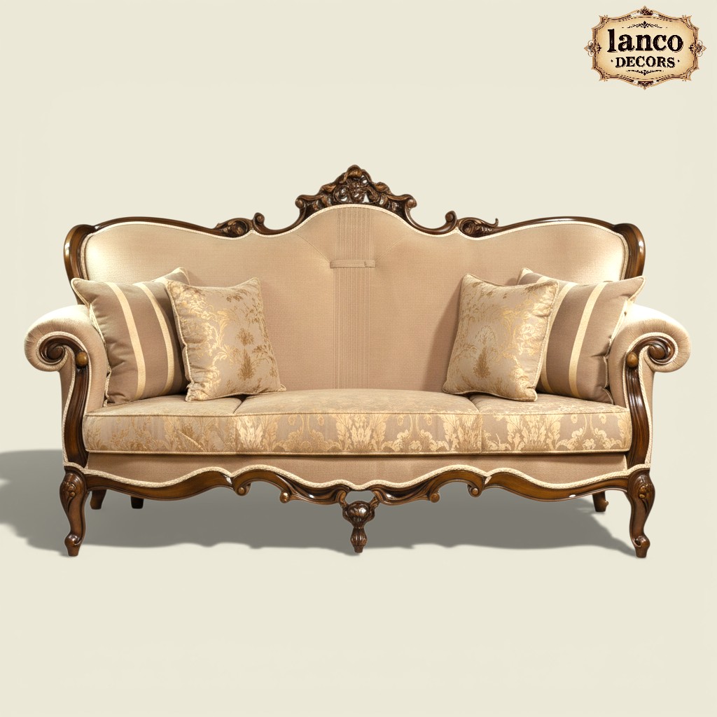 Expertly crafted from premium quality teakwood, this royal sofa set features intricate hand carvings inspired by classical palace architecture. The luxurious upholstery, refined curves, and grand silhouette create a commanding presence in any living space.