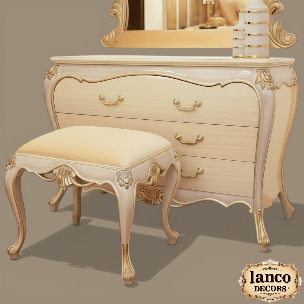 The luxurious mirror frame, elegant drawers and matching stool make it a statement vanity set for royal bedrooms, bridal suites and luxury interiors.