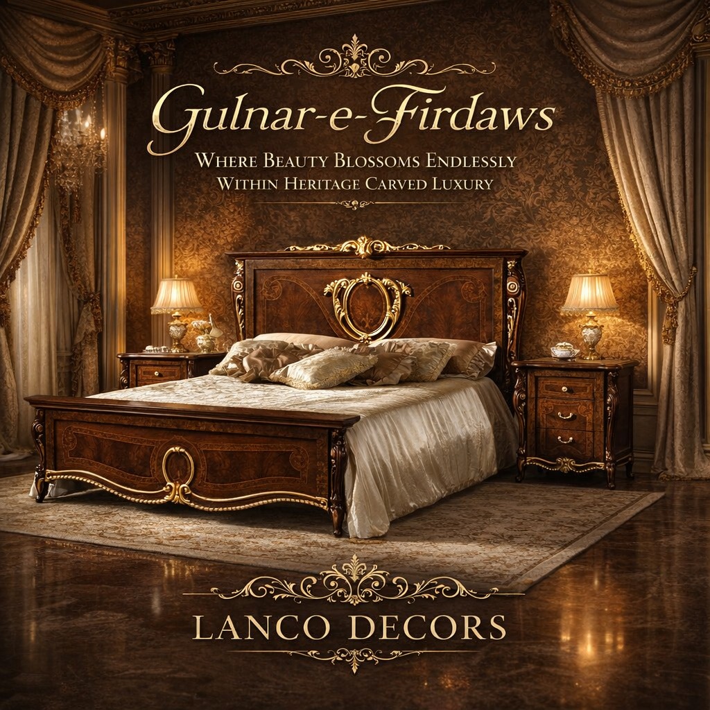 The Gulnar-e-Firdaws Royal Teakwood Bed is a tribute to timeless beauty and royal craftsmanship, designed to bring palace-inspired luxury into your home.