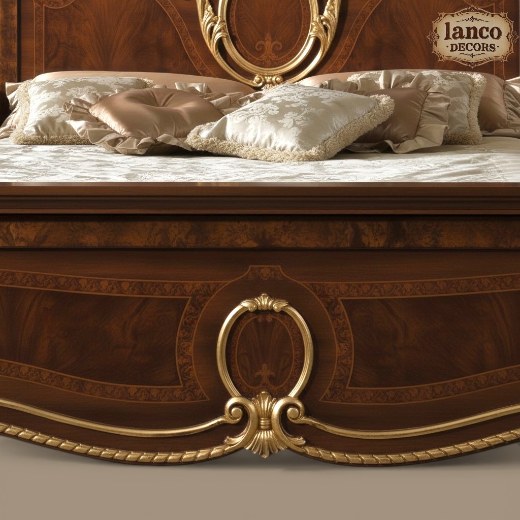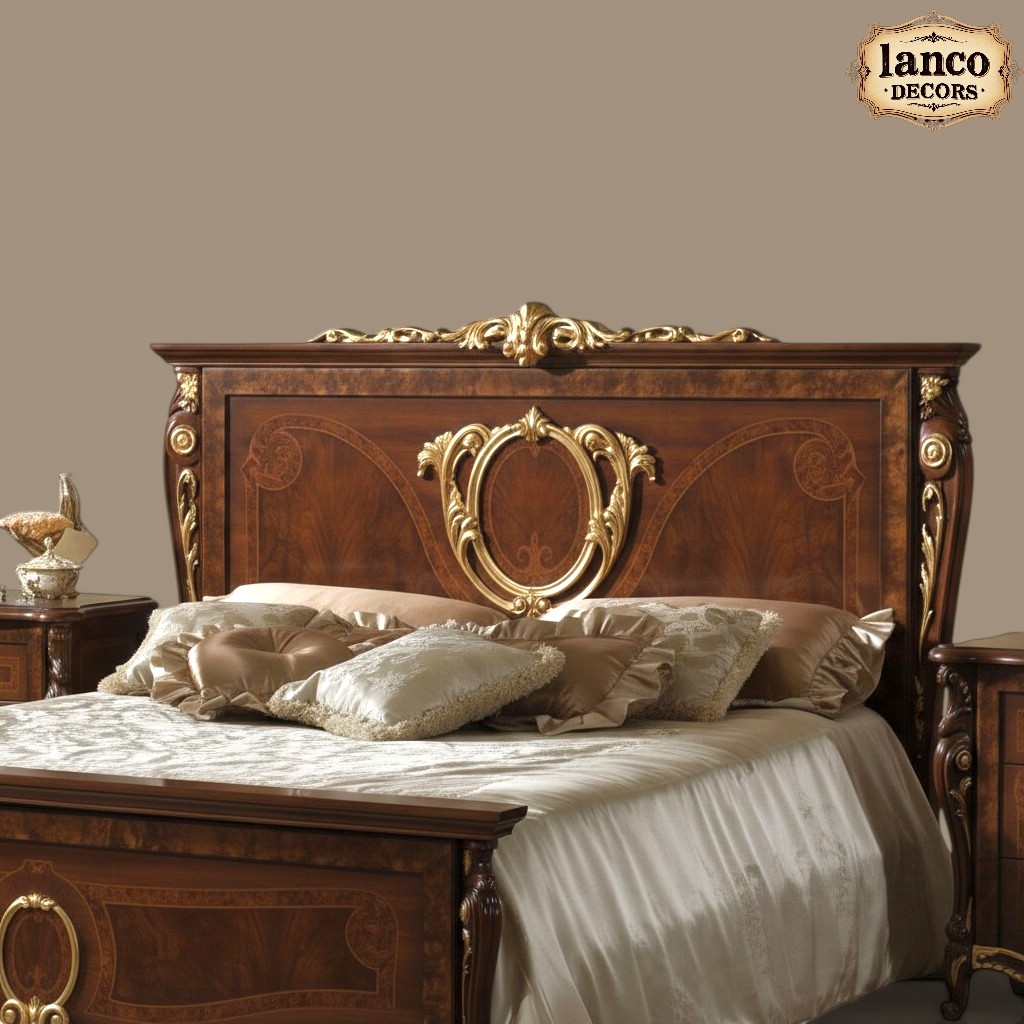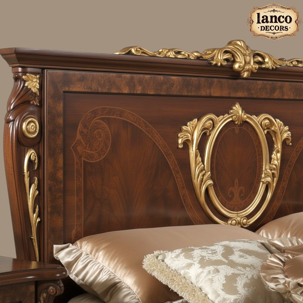 The grand headboard, adorned with ornamental detailing, creates a majestic focal point, while the sturdy construction ensures durability for decades. This is not just a bed — it is an heirloom built to define luxury living.