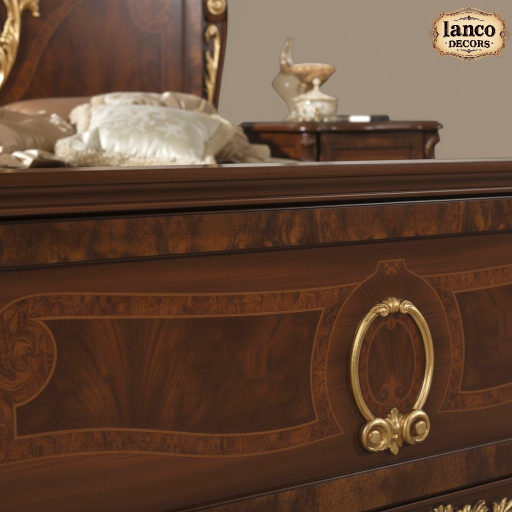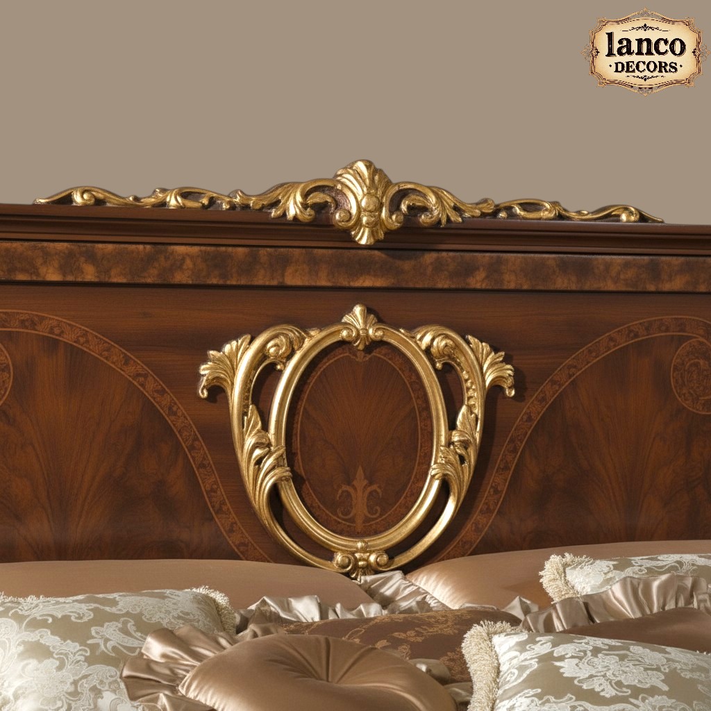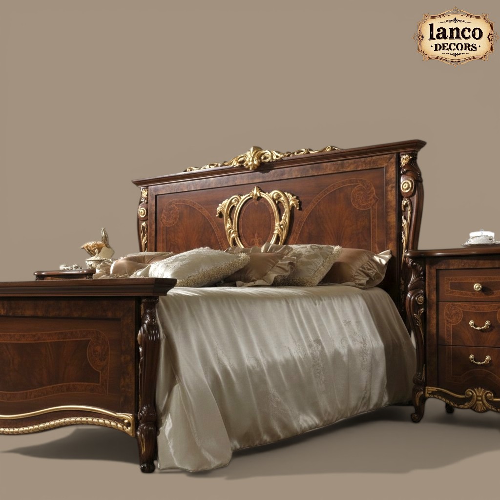 The grand headboard, adorned with ornamental detailing, creates a majestic focal point, while the sturdy construction ensures durability for decades. This is not just a bed — it is an heirloom built to define luxury living.