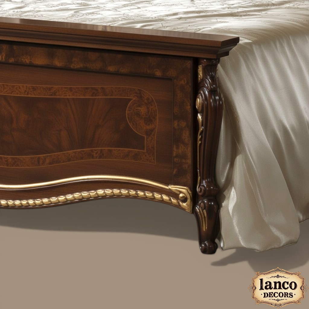 Crafted from 100% solid seasoned teakwood, this bed showcases exquisite hand-carved detailing, elegant proportions, and a rich polished finish that enhances the natural grain of the wood. Inspired by European Rococo and royal heritage aesthetics, every curve and carving reflects artistry passed down through generations.