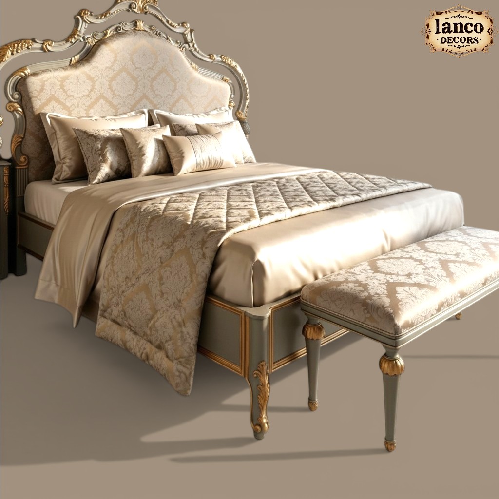 The upholstered headboard, finished with intricate patterns and elegant contours, enhances comfort while adding a regal presence. Paired with a matching bench, this ensemble delivers both luxury and functionality — designed for those who desire nothing less than perfection.