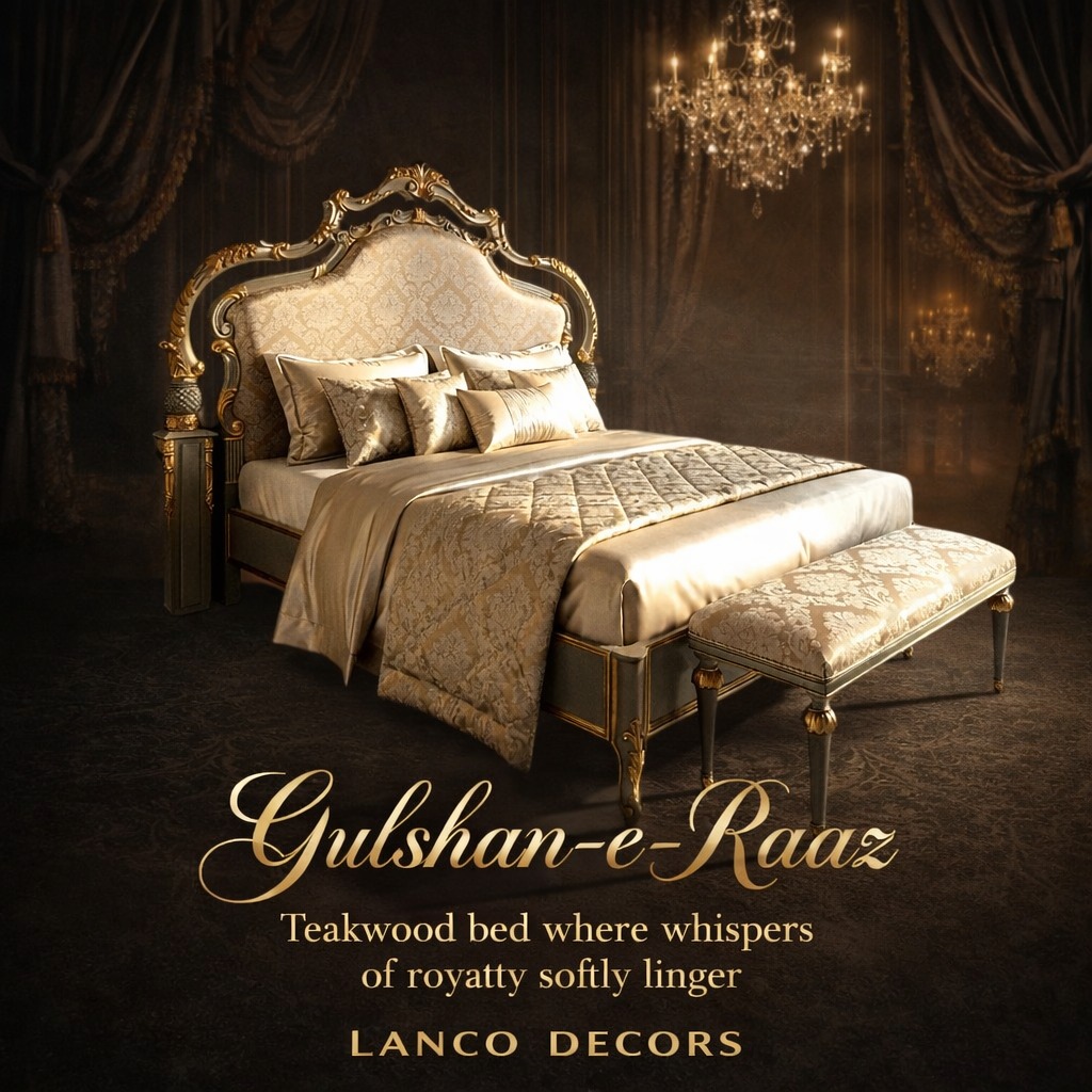 The Gulshan-e-Raaz Imperial Teakwood Bed is a poetic expression of luxury, crafted to transform your bedroom into a royal sanctuary.