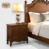 Ornate king-size bed, cushioned bench, and vintage-style side tables