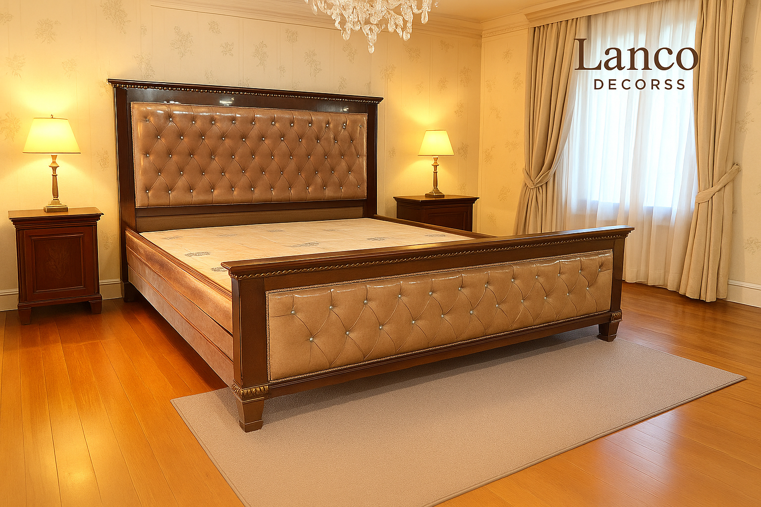 The Belmont Prestige Bed by Lanco Decors is a celebration of modern luxury with heritage craftsmanship. Crafted from solid wood and finished in a refined walnut tone, this king-sized bed features diamond-tufted suede upholstery on both headboard and footboard, giving your bedroom a rich hotel-inspired feel.