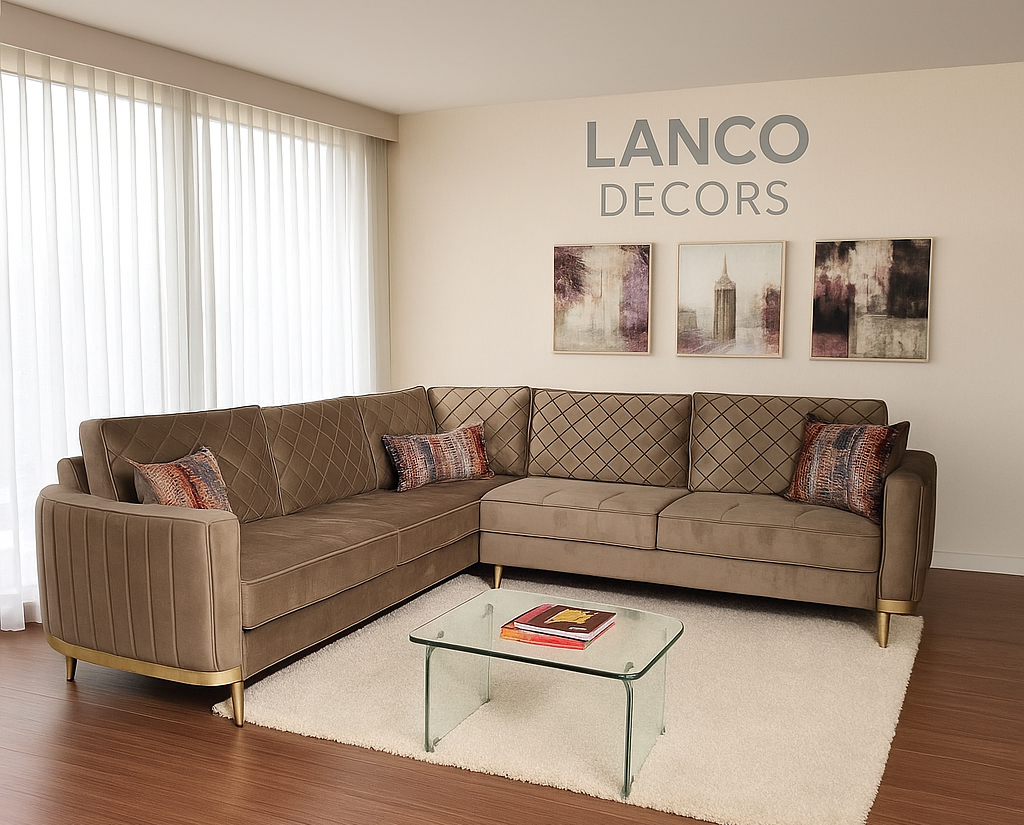 The Lanco Verona Luxe Sectional is where sophistication meets serious comfort. Designed for modern interiors with a taste for the refined, this L-shaped sofa features diamond-quilted taupe velvet upholstery, supportive back cushions, and gold-finished legs that scream subtle opulence.