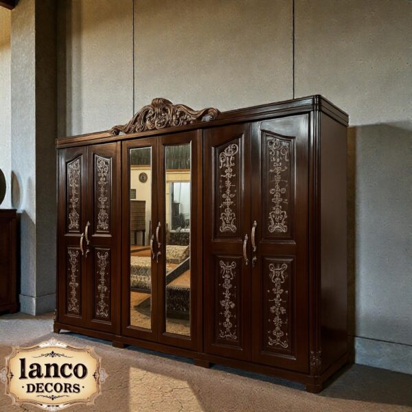 Elevate your bedroom with the Maharaja Royal Teak Wardrobe from Lanco Decors. Crafted from 100% premium teakwood, this 6-door wardrobe is a fine example of heritage woodworking. Each door features hand-carved floral motifs and antique-finish mirrors that add both functionality and opulence. The central mirrored doors enhance space visually, while the rich, dark finish and detailed crown top accentuate its royal appeal. Ideal for classic, heritage, or luxury-themed interiors.