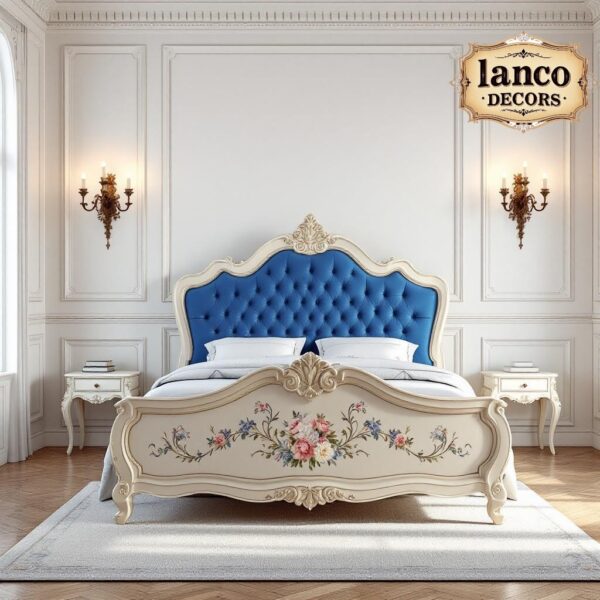 The Majestique Bloom is more than a bed — it’s a declaration of taste. Handcrafted to embody classic European design, this piece features a regal royal blue tufted headboard set in a carved antique-white frame. The footboard displays intricate hand-painted floral detailing, turning every inch of this piece into a timeless work of art.