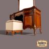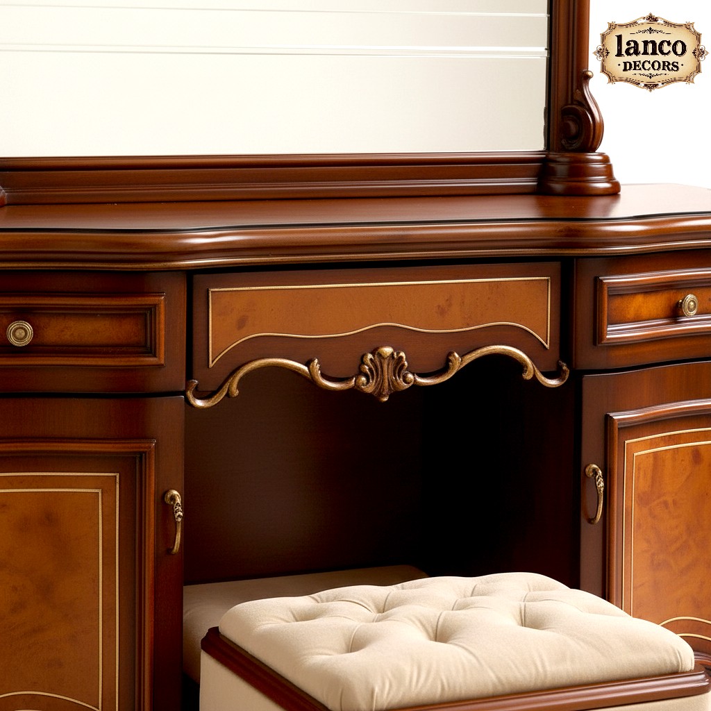 Crafted from premium teakwood and finished with dual-tone panels and ornate carvings, this vanity is elegance in its purest, most overachieving form. The oversized mirror, crowned with carved embellishments, invites admiration — while the plush tufted ottoman ensures your throne is as regal as your reflection.