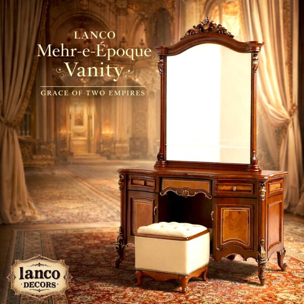 The Mehr-e-Époque Vanity from Lanco Decors is a poetic homage to grandeur — blending the structured elegance of European Époque design with the rich, flowing lines of Eastern royal heritage.