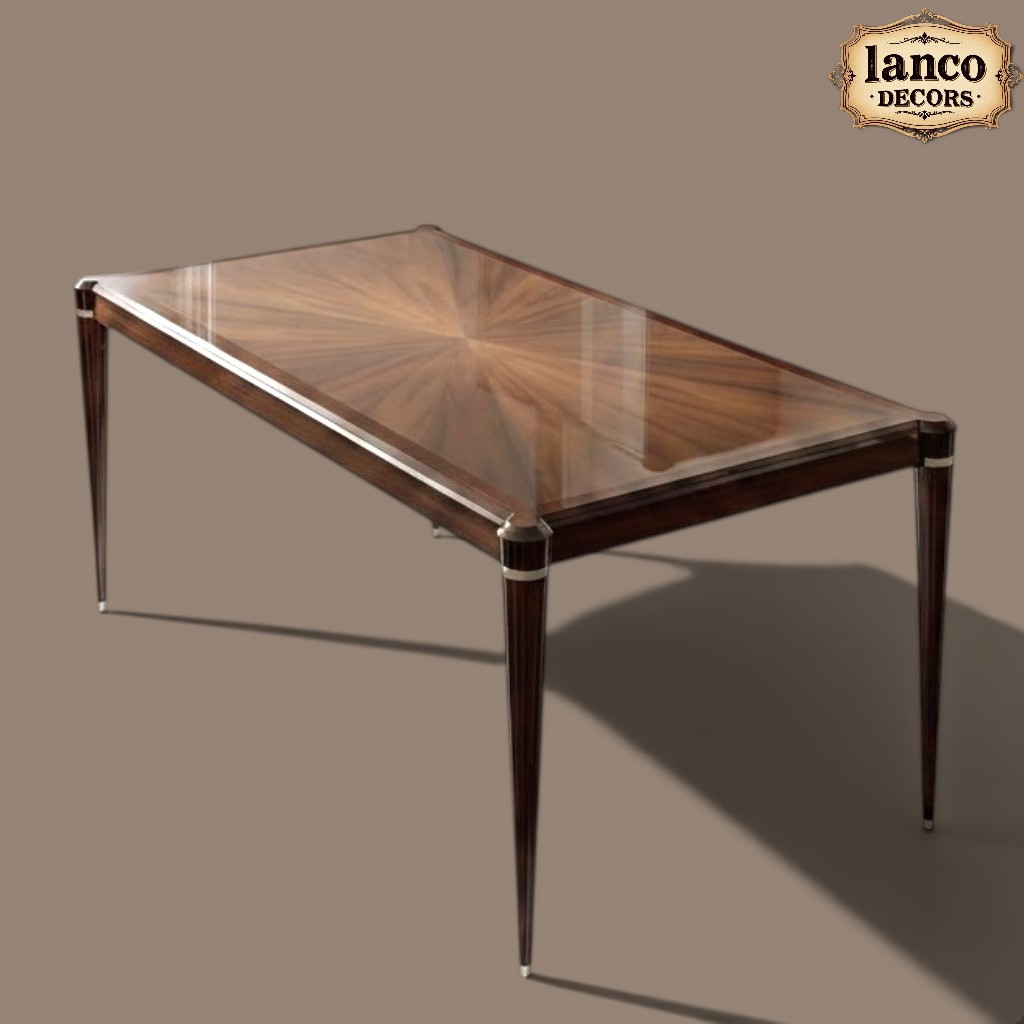 Crafted from solid teakwood, the table features a rich natural grain pattern with a flawless polished finish that reflects sophistication. The sleek yet sturdy structure is complemented by ergonomically designed upholstered chairs, ensuring both comfort and style.