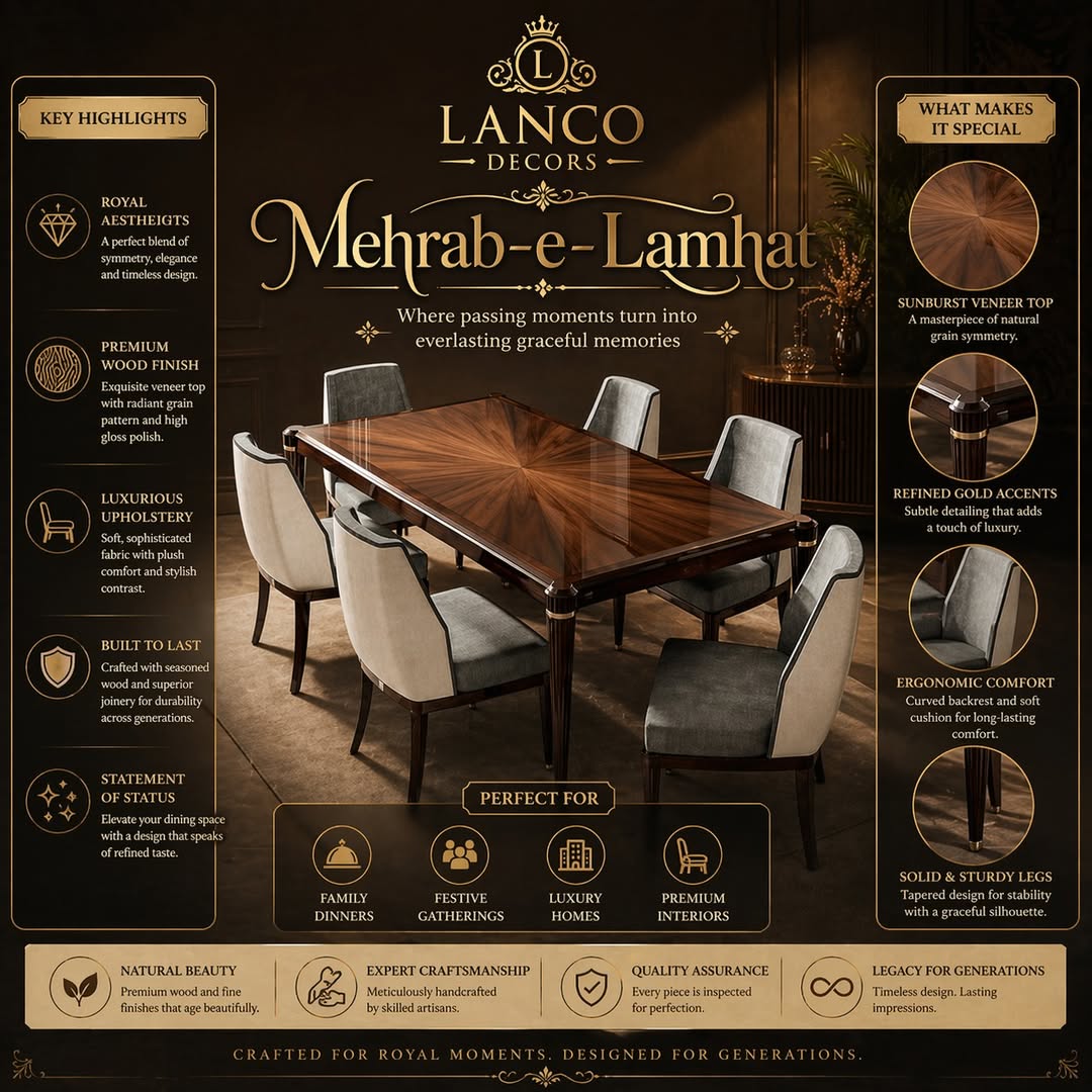 The Mehrab-e-Lamhat Dining Collection is a refined expression of modern luxury blended with timeless craftsmanship. Designed for those who appreciate understated elegance, this dining set transforms everyday dining into an elevated experience.