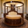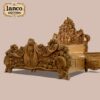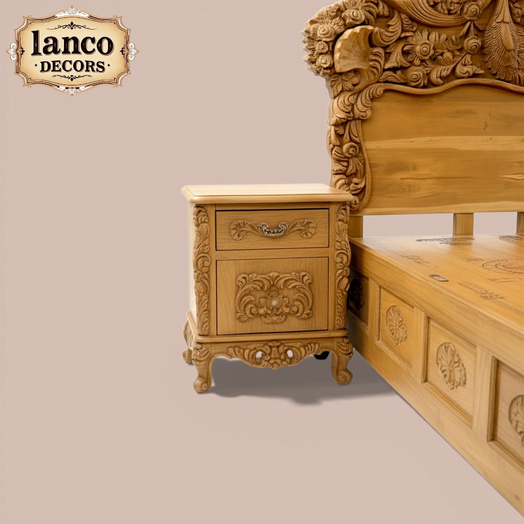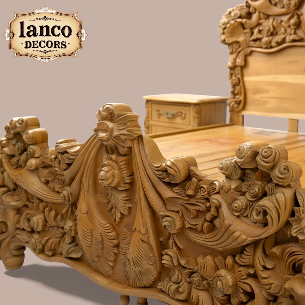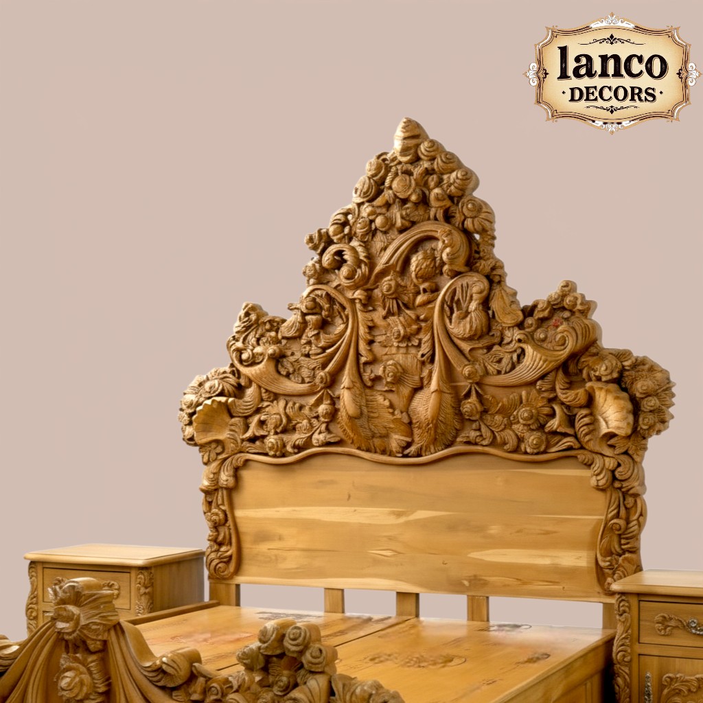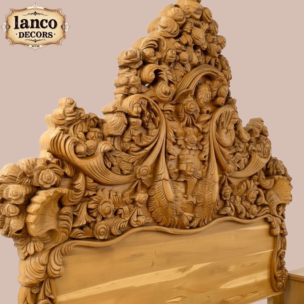 Crafted from premium hardwood and left in a natural, majestic matte finish, this bed is a living sculpture. The headboard rises like a throne, draped in regal detailing, while the footboard echoes with cascading layers of ornamental motifs. This is more than furniture — it’s a family heirloom in waiting, probably more loyal than most relatives.