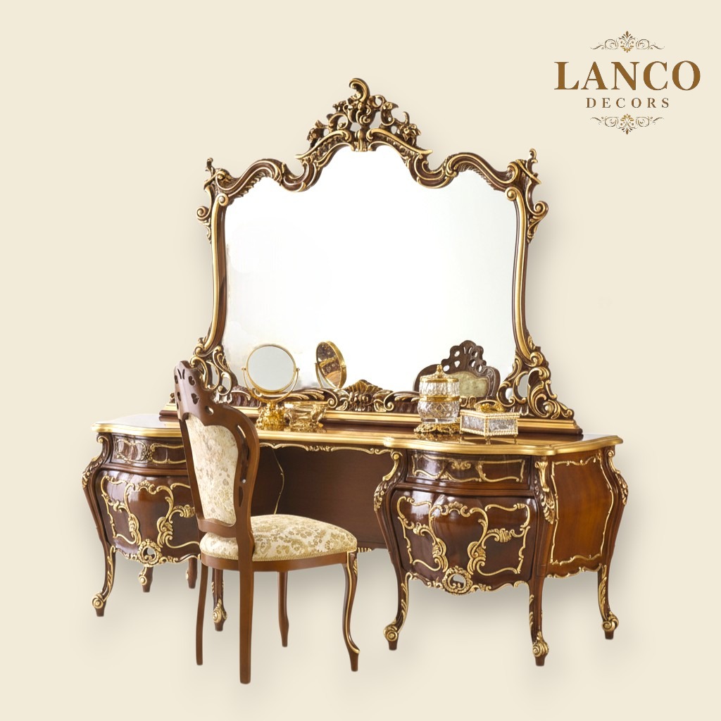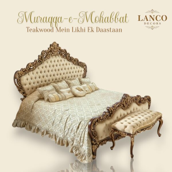 Muraqqa-e-Mohabbat is not merely a bedroom set — it is a handcrafted ode to romance and regality. Made from the finest seasoned teakwood, this luxurious bed features a sculpted headboard with button-tufted detailing, wrapped in creamy upholstery, and finished with hand-carved floral motifs in rich mahogany gold.
