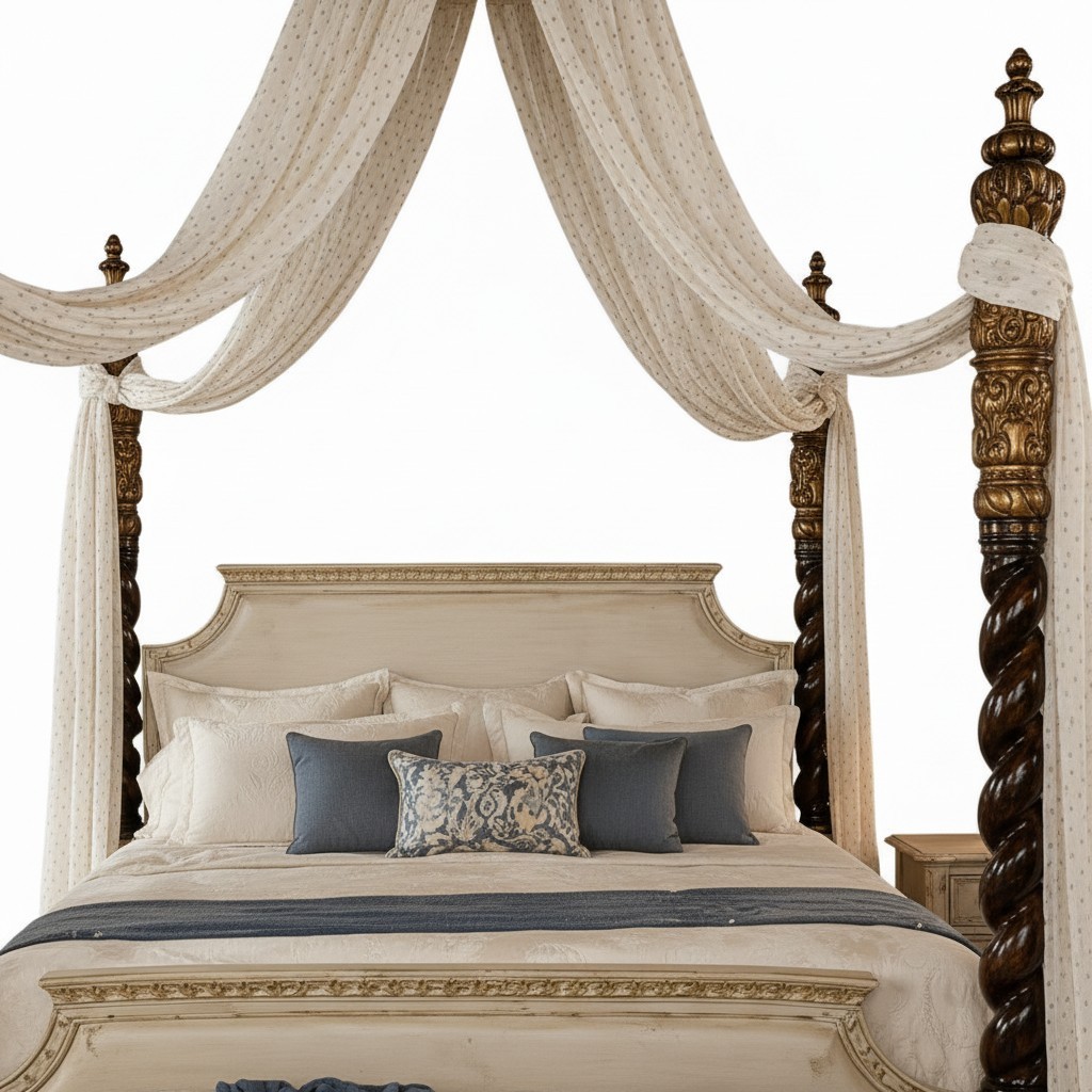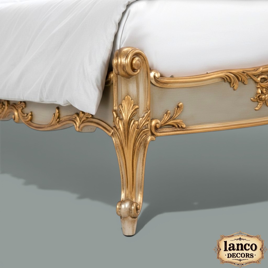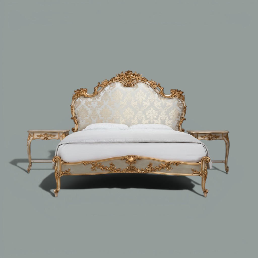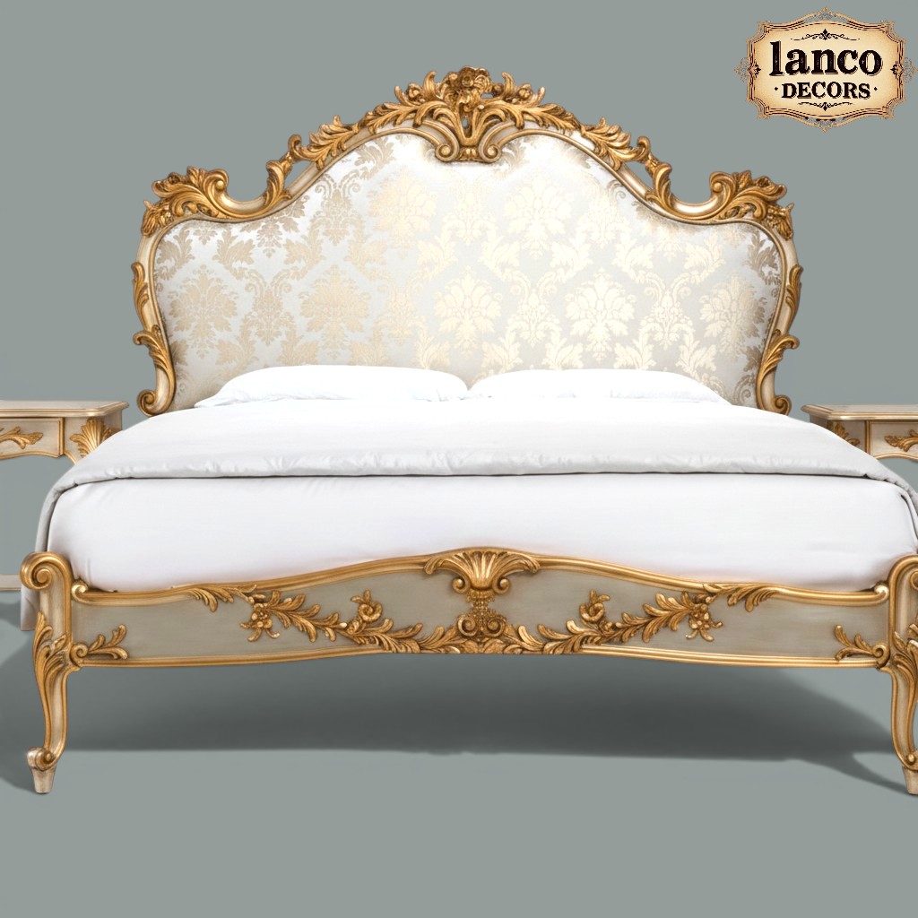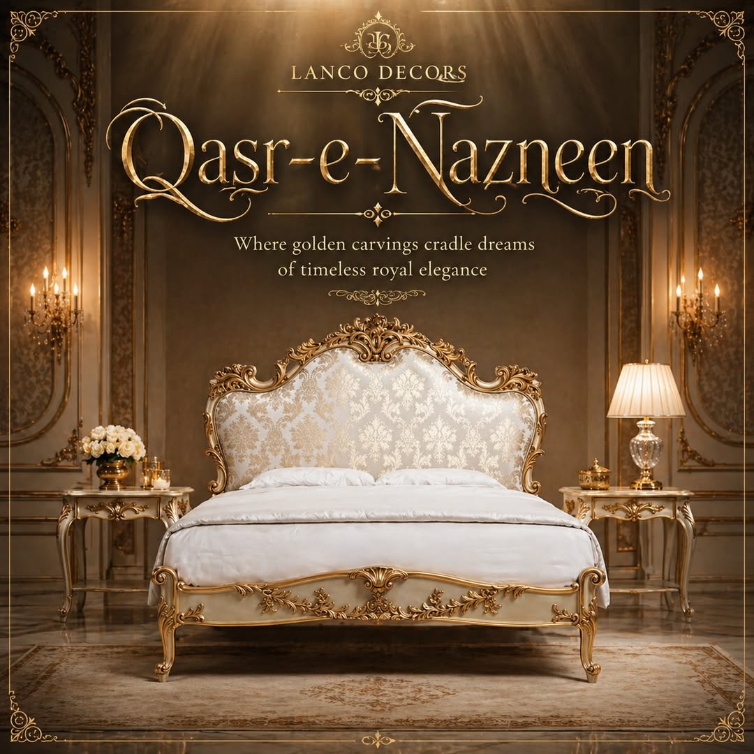 The Qasr-e-Nazneen Bed is a symbol of refined luxury and timeless craftsmanship. Designed for those who appreciate elegance in every detail, this masterpiece is handcrafted from premium solid teakwood and adorned with exquisite gold-accented carvings.