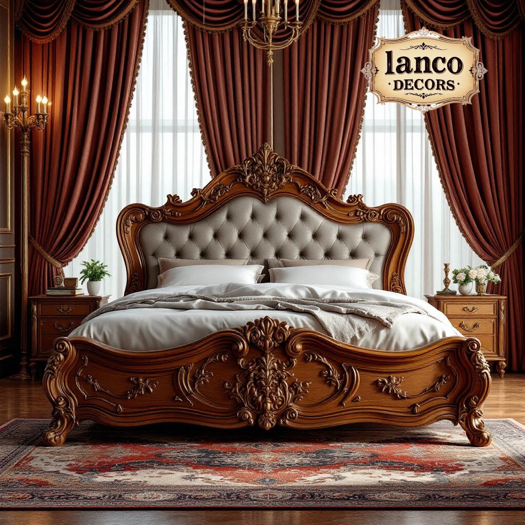 The Regalis Royale Teak Bed from Lanco Decors is a celebration of classical European elegance fused with timeless Indian craftsmanship. Sculpted from premium-grade teakwood, the bed features an exquisitely hand-carved frame, deep floral motifs, and a grand upholstered headboard that radiates aristocratic charm.