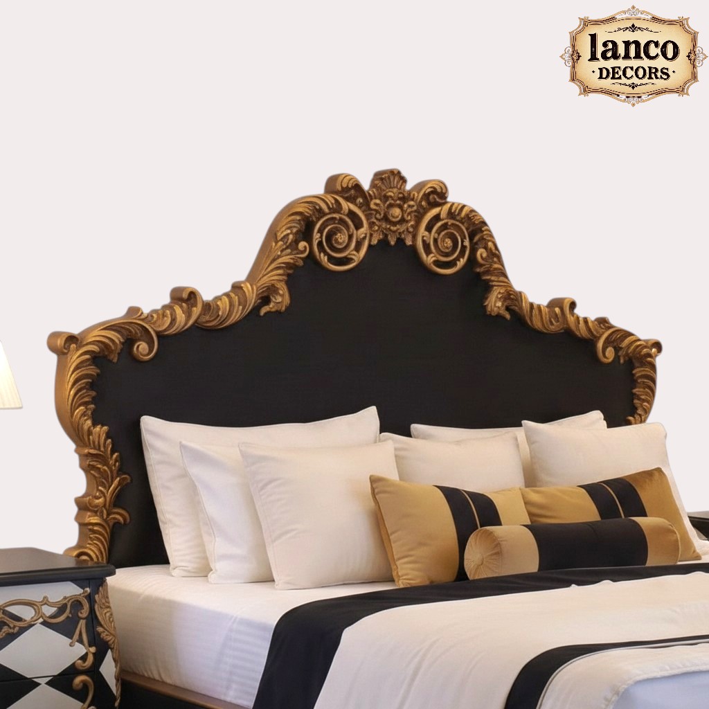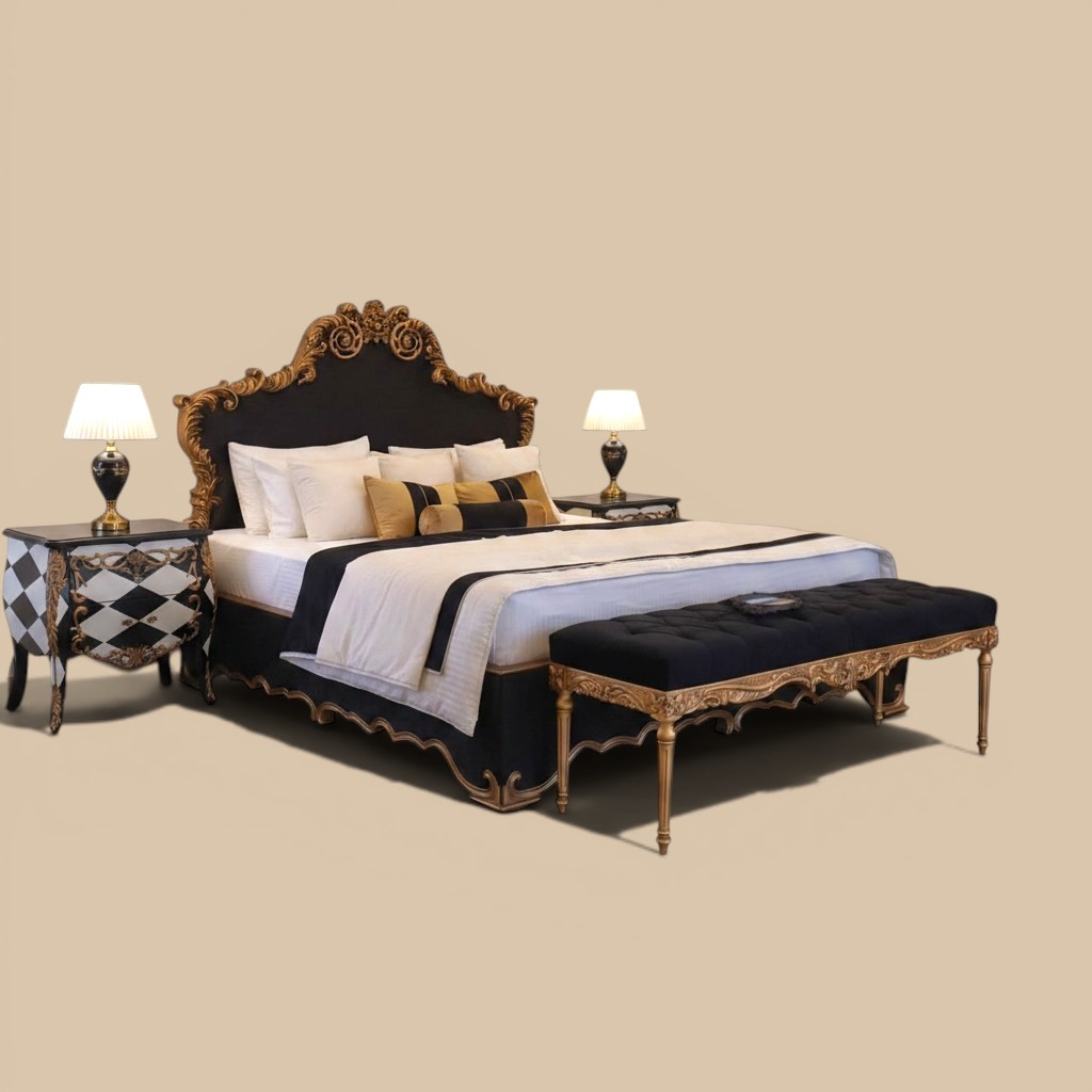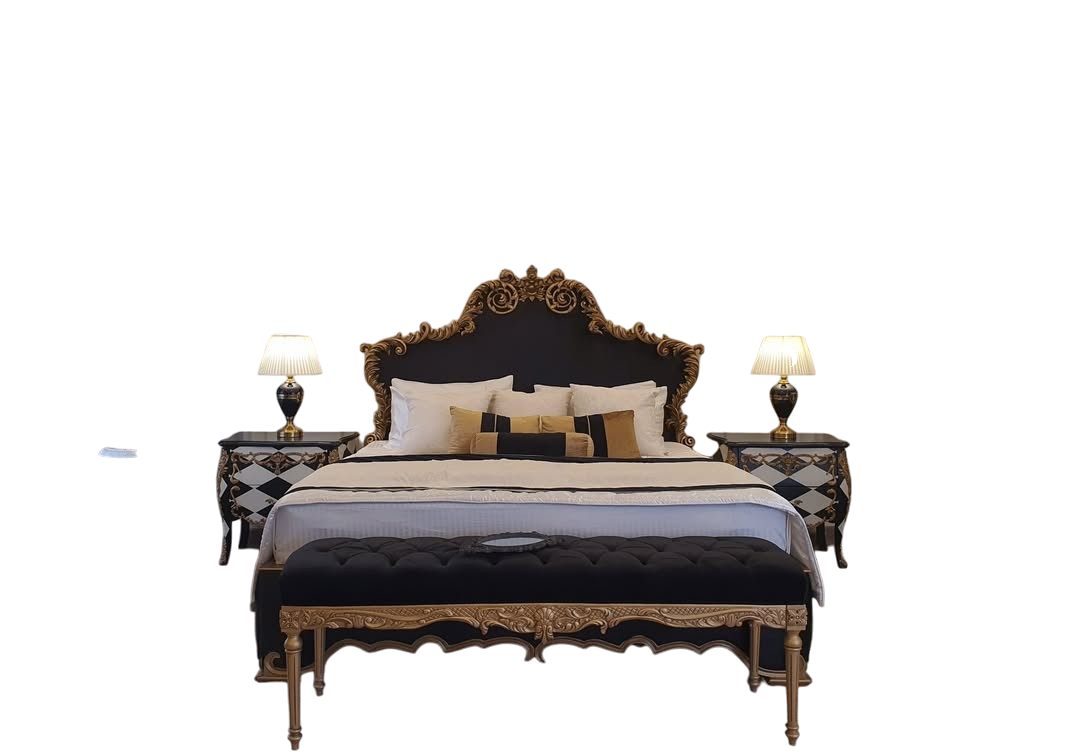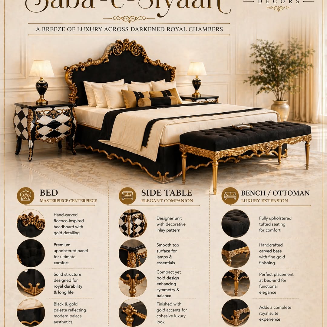 The Saba-e-Siyaah Bedroom Suite is a refined expression of bold luxury and timeless craftsmanship. Designed to capture the elegance of royal chambers, this masterpiece blends deep black tones with rich gold accents, creating a striking yet sophisticated presence.