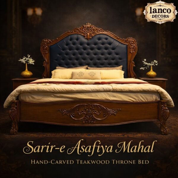 The Sarir-e-Asafiya Mahal Hand-Carved Teakwood Throne Bed is a majestic blend of heritage craftsmanship and luxurious refinement. Expertly constructed from premium-grade solid teakwood, this bed features intricate hand-carved detailing along the headboard, footboard, and sculpted frame.