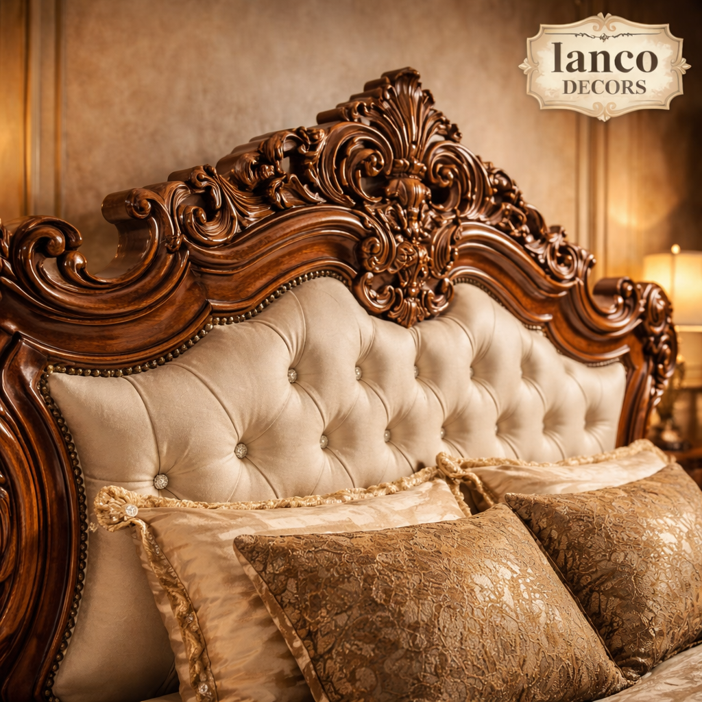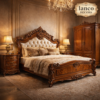 The plush upholstered headboard enhances both comfort and luxury, while the finely carved footboard and side panels reflect true artisan craftsmanship. Paired with matching side tables and wardrobe, this bedroom ensemble creates a complete royal ambiance.