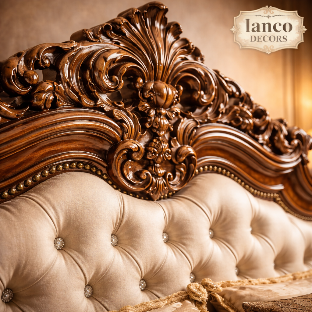 Introducing the Sarv-e-Shahenshah Royale Bed, a masterpiece crafted in 100% solid seasoned teakwood, embodying the grandeur of royal heritage interiors. Designed in a classic Rococo-inspired style, this bed showcases intricate hand-carved detailing, elegant curves, and a rich polished finish that highlights the natural beauty of teakwood grain.