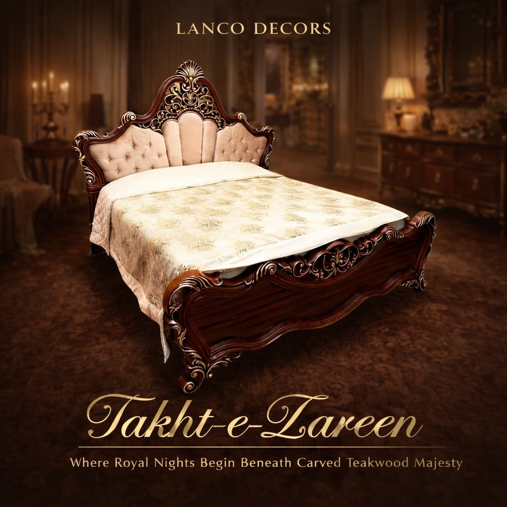 The Takht-e-Zareen Royal Bed is a luxurious palace-inspired masterpiece designed to transform bedrooms into royal chambers.