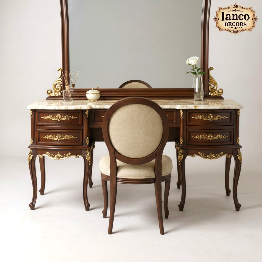 The Bridal Heirloom Vanity from Lanco Decors is the kind of piece you pretend to accidentally inherit. Designed to capture the romantic charm of European bridal suites, this vanity features ornate gold embellishments, a grand arching mirror, and luxurious marble-top finishing. The delicately curved legs and hand-carved flourishes whisper vintage sophistication, while the spacious drawers store all your “just-in-case” beauty products.