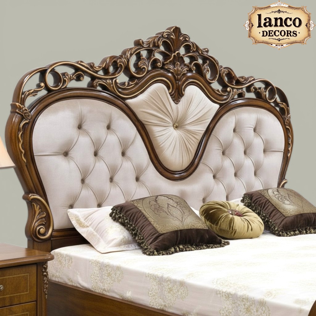 The grand upholstered headboard, finished in luxurious tufted fabric, adds depth, comfort, and regal sophistication. Flowing curves and ornamental carvings reflect palace-inspired design, while the rich polished teak finish highlights the natural grain and durability of the wood.