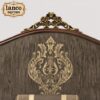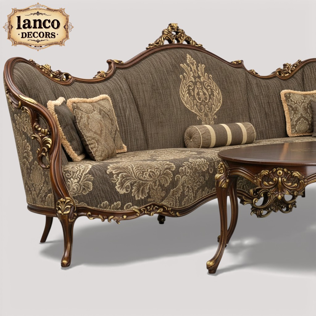 Sumptuous damask upholstery in deep chocolate and gold tones, embroidered crest included (because subtlety is overrated)