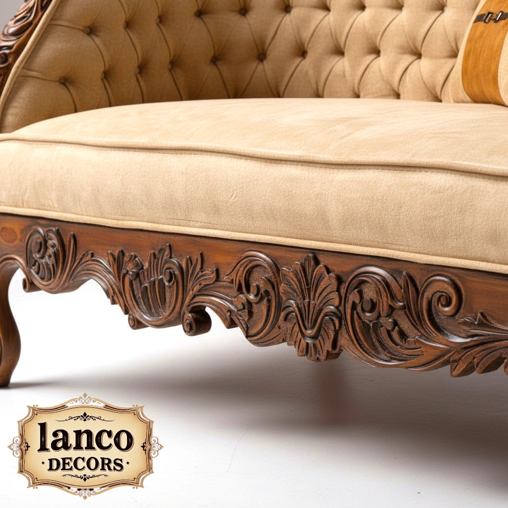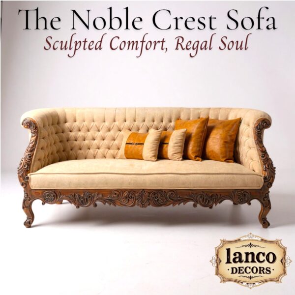 The Noble Crest Sofa — Sculpted Comfort, Regal Soul is a celebration of refined craftsmanship and timeless design. Built on a solid teakwood frame, the sofa features intricately hand-carved accents along its base and arms, paired with deep tufted upholstery for supreme comfort.