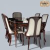 The grand rectangular dining table is paired with elegantly designed high-back upholstered chairs, offering both superior comfort and stately presence. The colonial-inspired silhouette, subtle carvings, and structured form reflect timeless sophistication suited for formal dining rooms and luxury interiors.