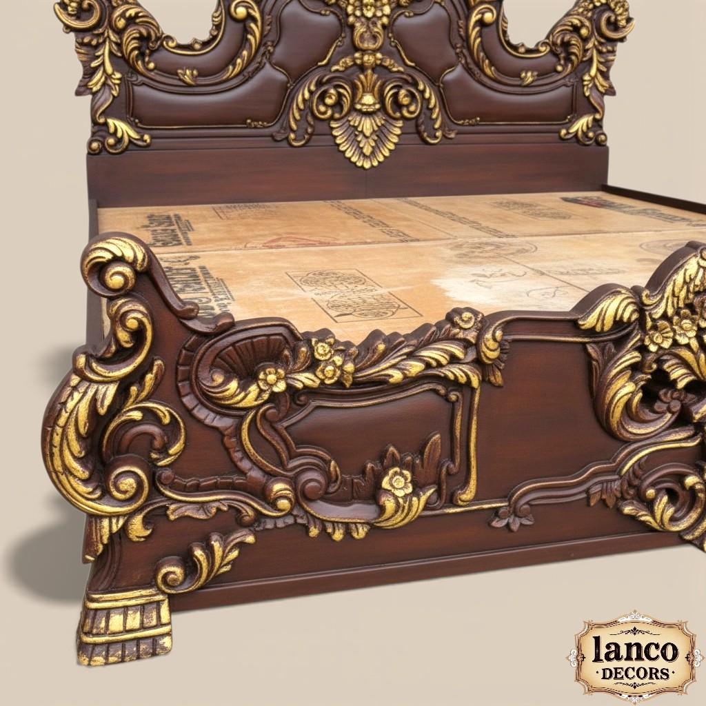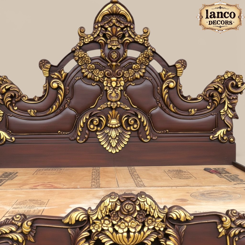 Crafted from premium seasoned solid teakwood, the structure ensures exceptional durability while showcasing the rich natural beauty of the wood grain. The elaborate carvings and royal proportions transform the bed into the centerpiece of any luxury bedroom.