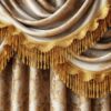 Presenting The Sovereign Drape – a curtain set so regal it might file taxes under “Royalty.” This commanding ensemble pairs heavy bronze jacquard drapes with creamy satin sheers, bound together by gold tasseled tiebacks and crowned with an extravagant scalloped valance trimmed in fringe.
