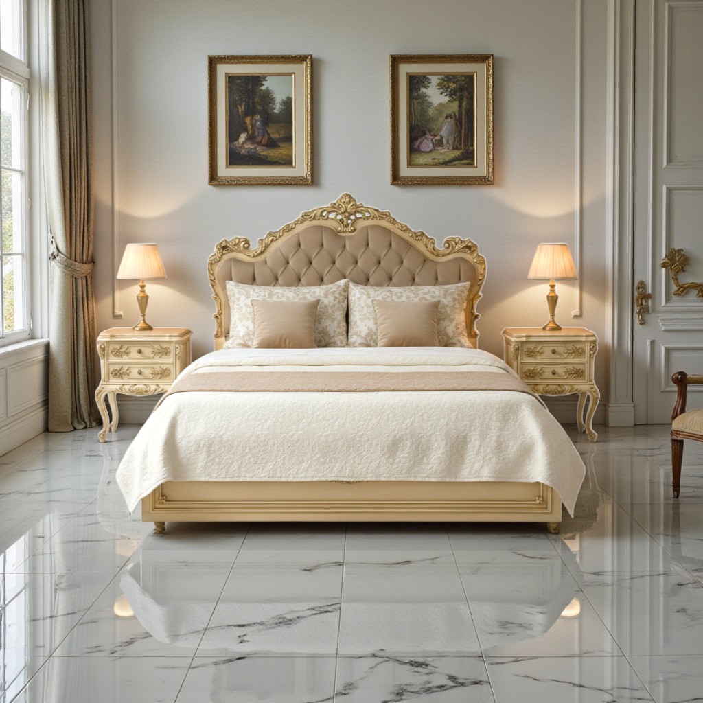 Let your bedroom reign in luxury with the Versailles Elegance Bed Set from Lanco Decors – a timeless tribute to French classic design. The stunning tufted headboard is wrapped in a soft ivory fabric, framed with hand-carved golden accents that whisper opulence. Paired with matching antique-style side tables, this set is where vintage charm meets modern-day comfort.