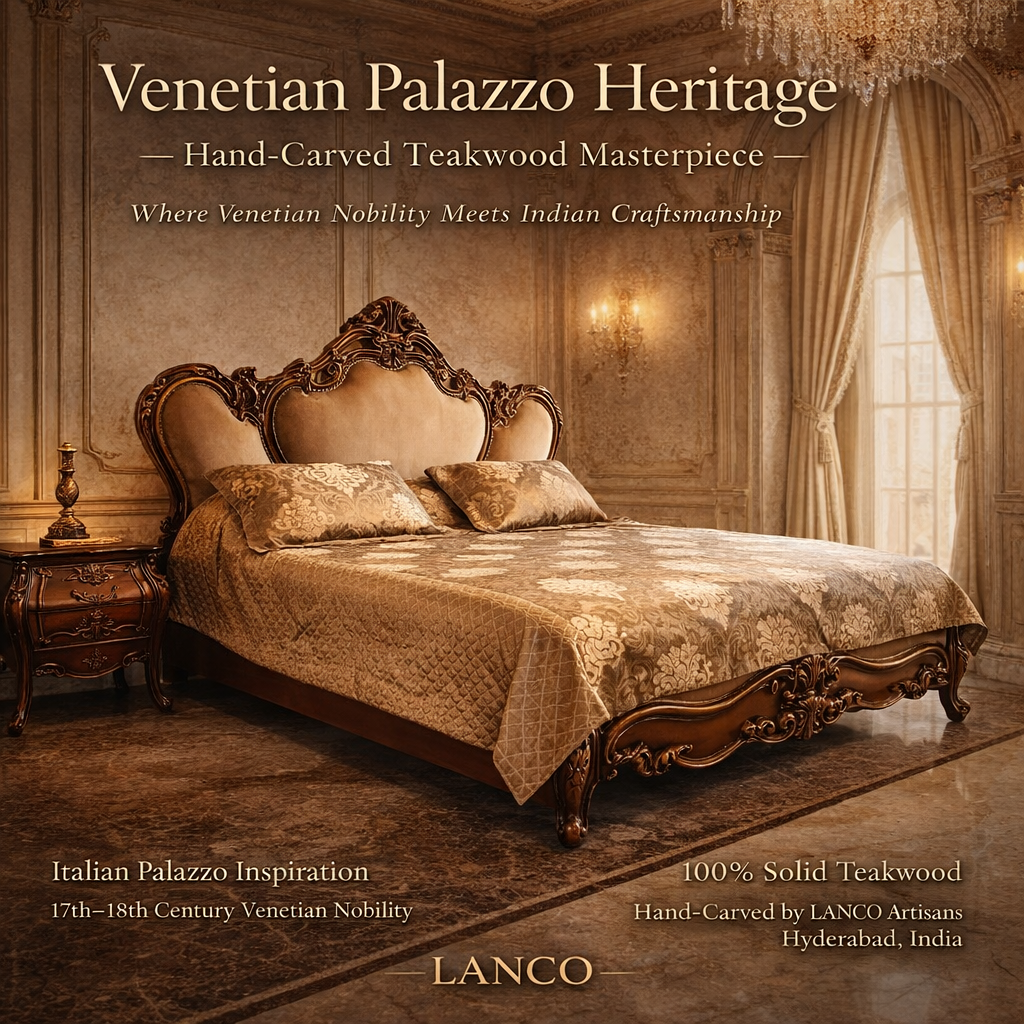 The Venetian Palazzo Heritage by LANCO Furniture & Handicrafts represents the finest in luxury teakwood beds in Hyderabad, designed for homeowners who value timeless elegance and heirloom craftsmanship. Inspired by 17th–18th century Venetian palace interiors, this classic solid wood bed blends European grandeur with the strength and durability of Indian teakwood.