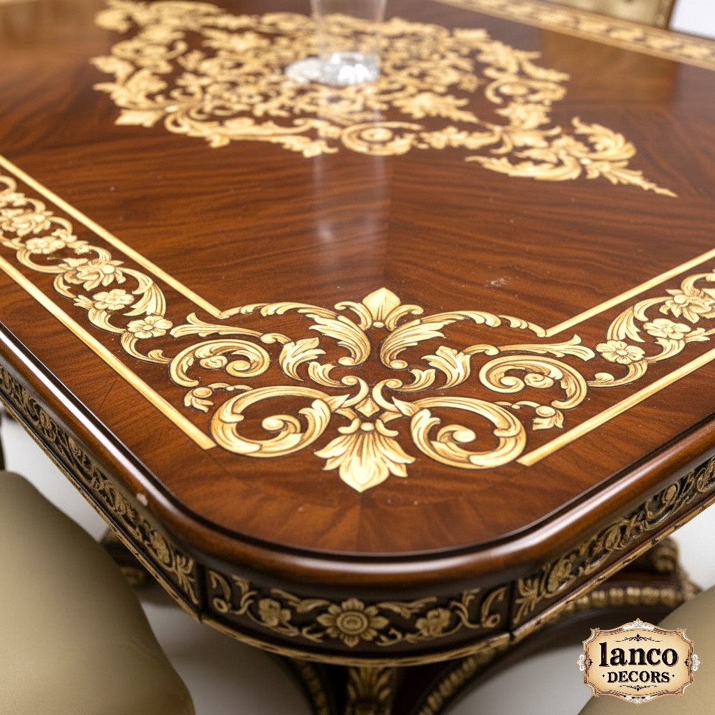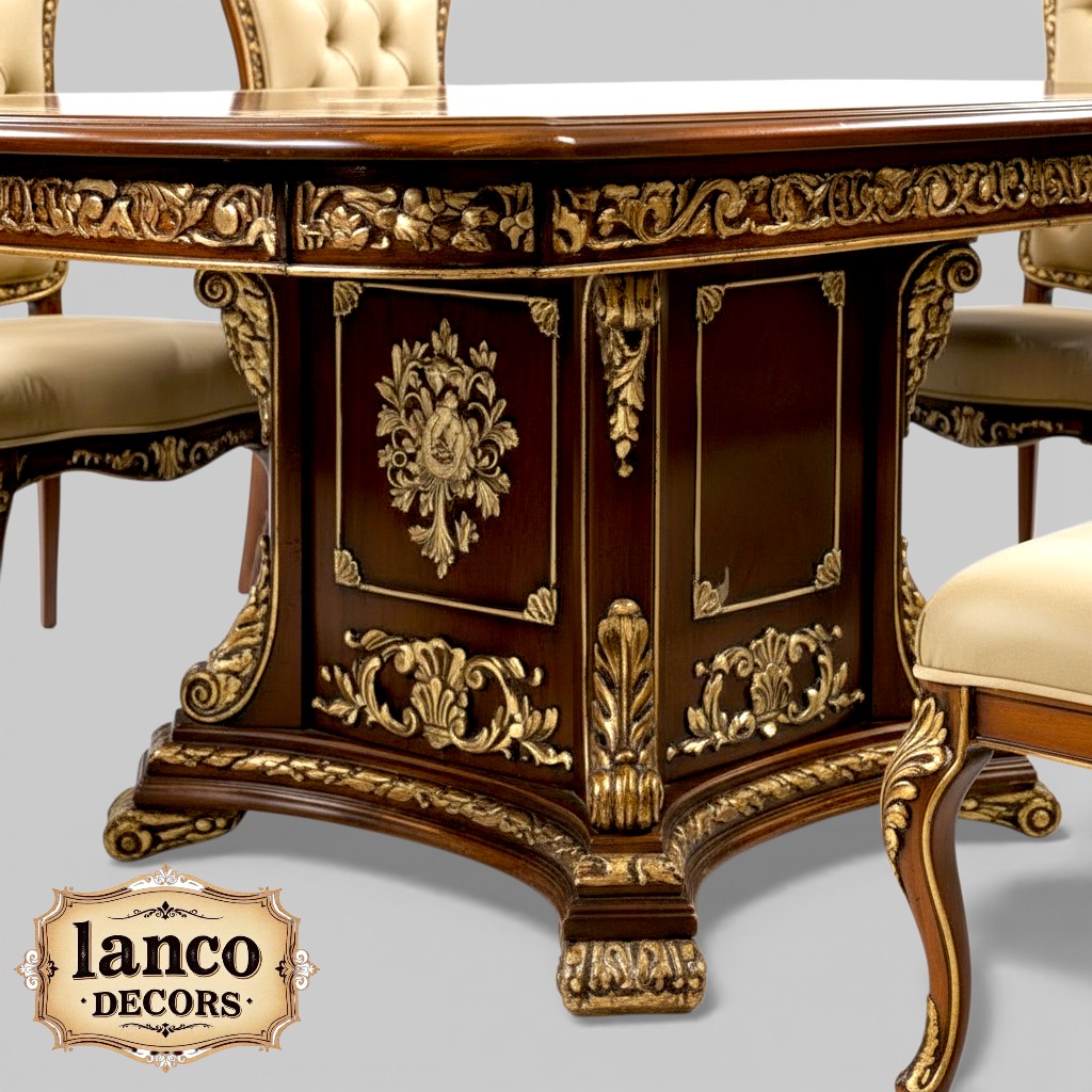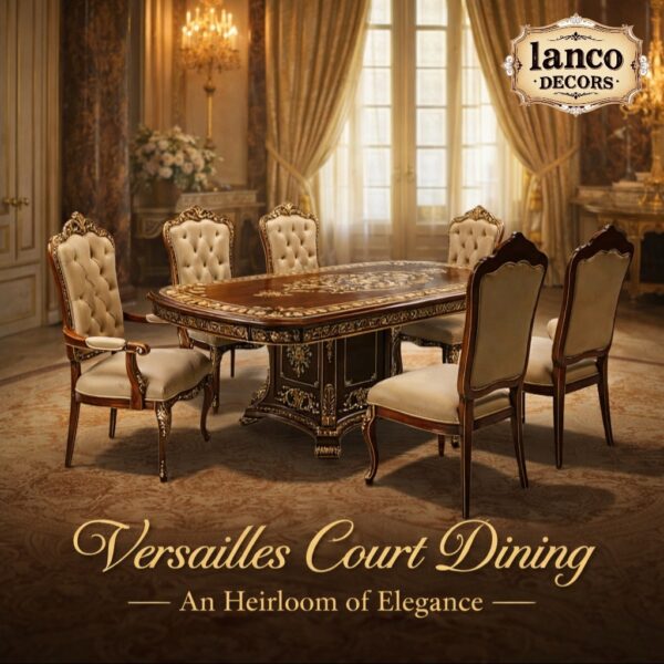 Step into the golden age of grandeur with the Versailles Court Dining suite by Lanco Decors — a handcrafted tribute to the timeless artistry of French court design. This opulent set transforms ordinary dinners into royal banquets, complete with the ghost of etiquette past nodding in approval.
