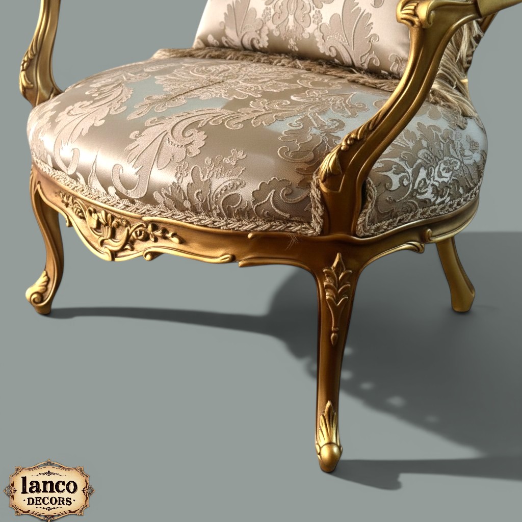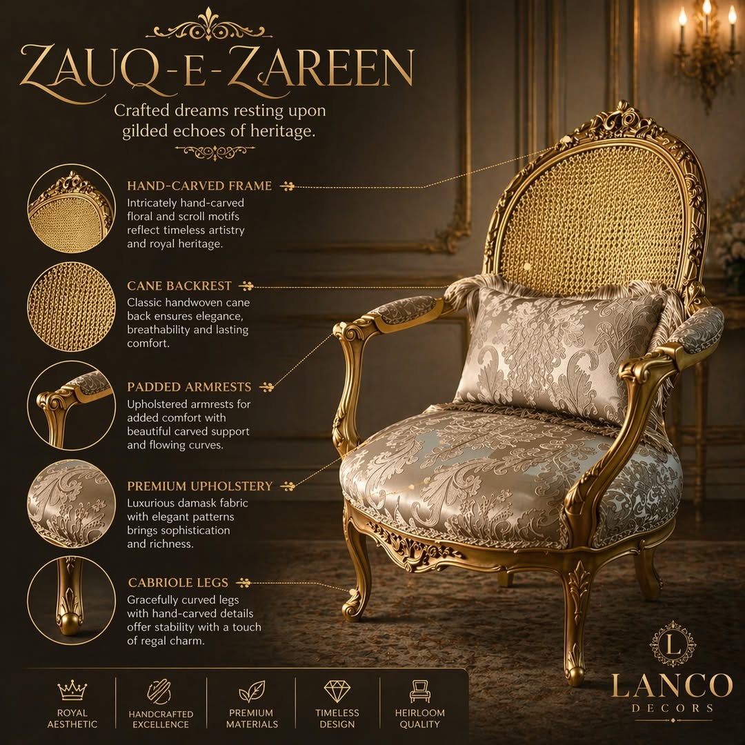 The Zauq-e-Zareen Royal Accent Chair is a masterpiece of elegance and craftsmanship, designed to bring refined luxury into your living space. Inspired by classic Rococo artistry, this chair showcases graceful curves, intricate carvings, and a rich gold-toned finish that radiates sophistication.