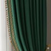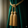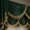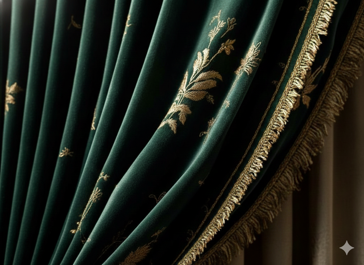 Inspired by the regal chambers of Nizami palaces, the Zümrüt-e-Nizam Drapes embody opulence in its most graceful form. Crafted in deep emerald velvet and adorned with intricate gold floral embroidery, these drapes are crowned with a lavish swag valance finished in antique fringe detailing.