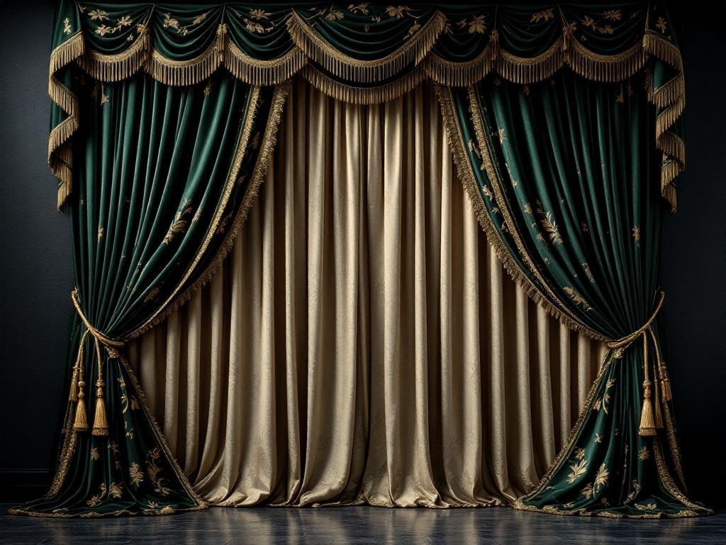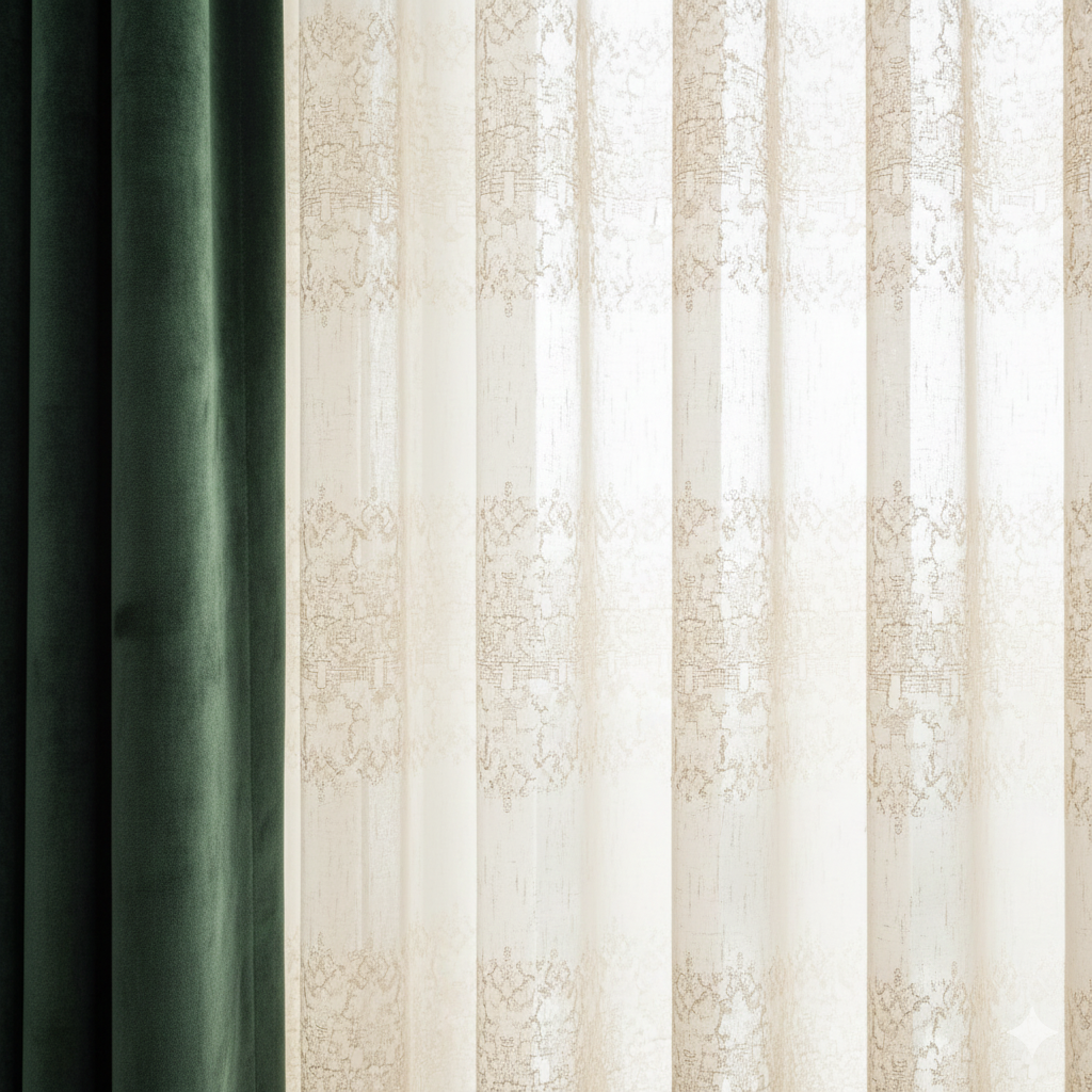 The inner champagne-toned sheer layer softly diffuses light, creating a warm, serene ambiance while maintaining privacy. Designed for luxury bedrooms, formal living spaces, and heritage interiors, every pleat reflects meticulous tailoring and timeless aristocratic taste.